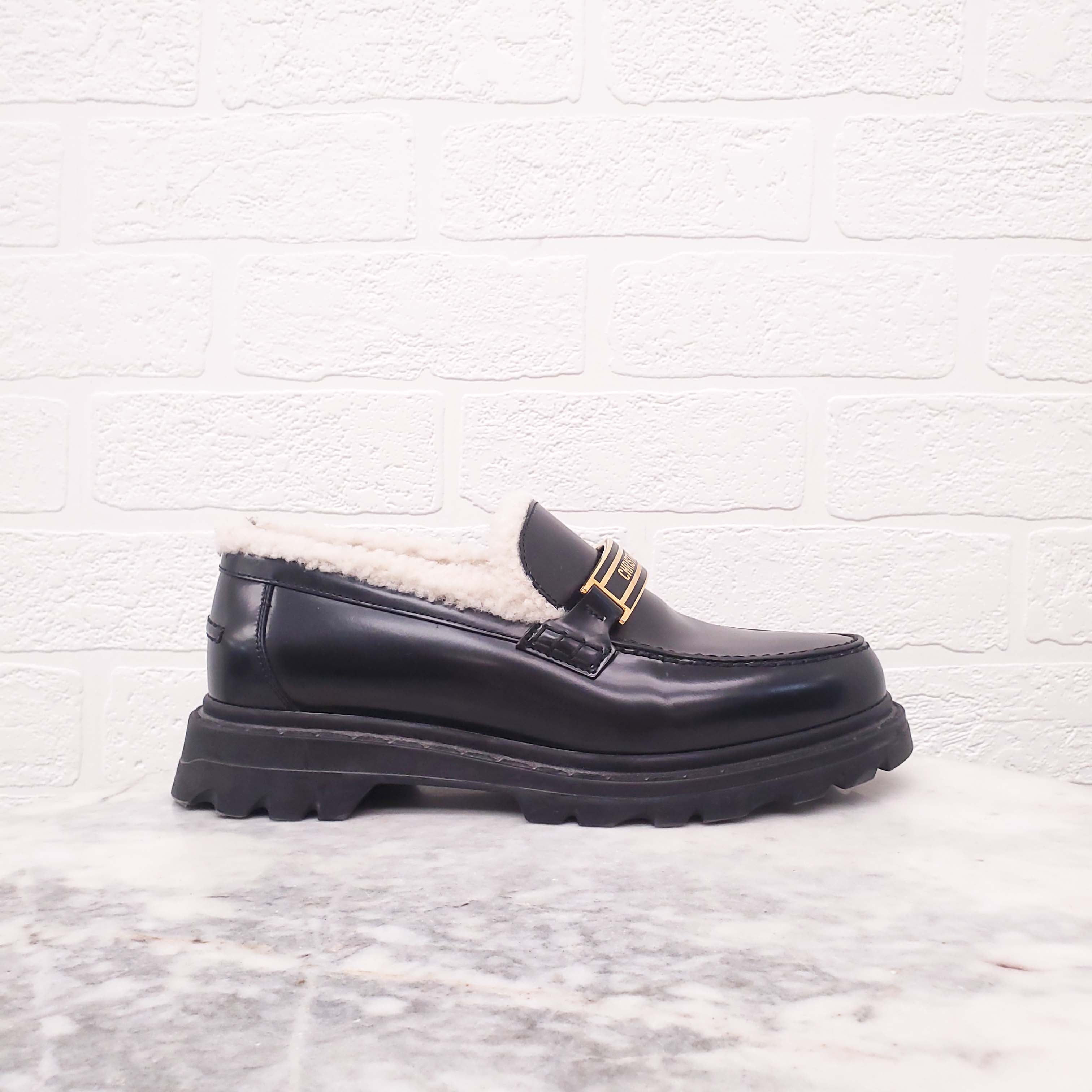 CHRISTIAN DIOR BLACK LEATHER LOAFERS WITH SHEARLING DETAIL - SIZE 38.5