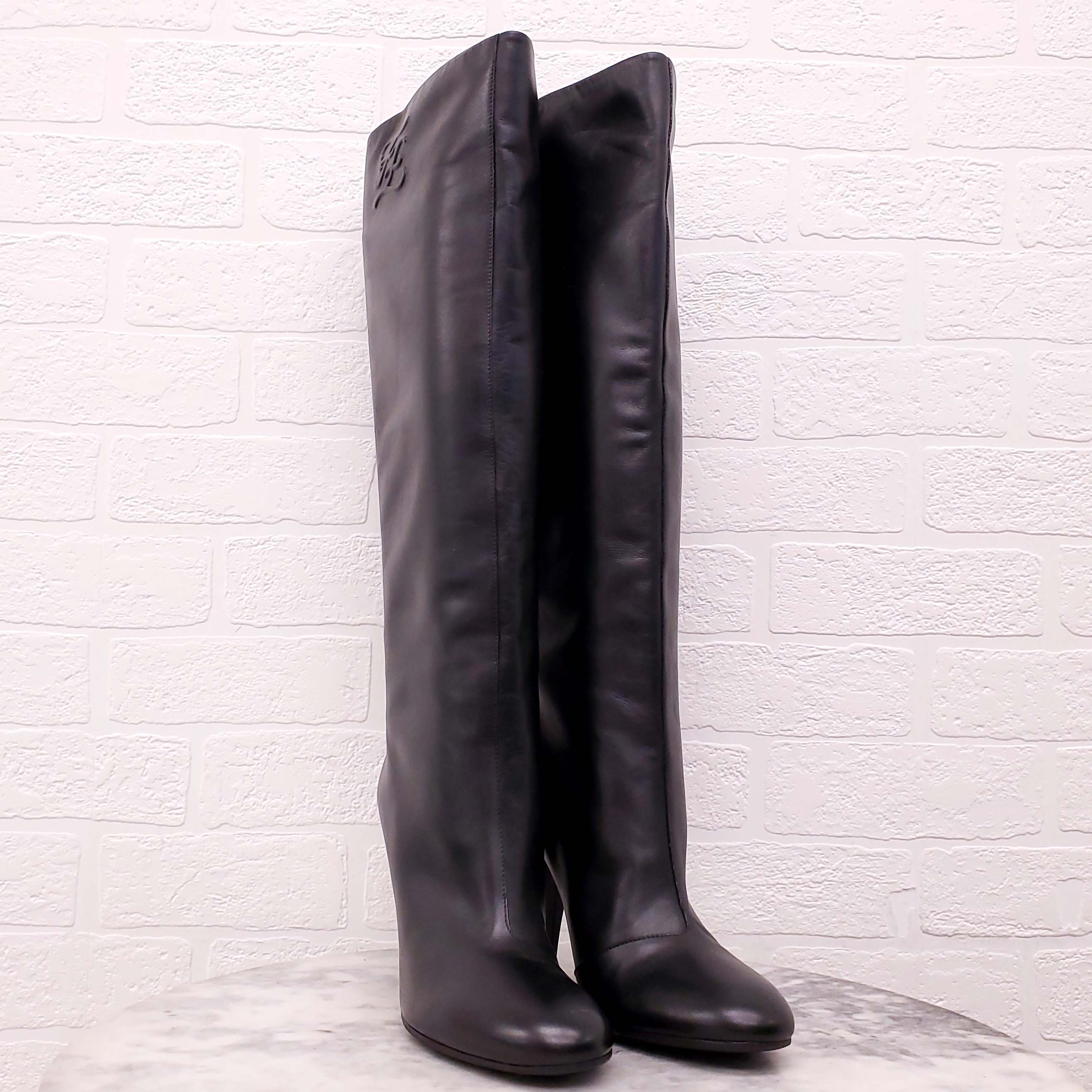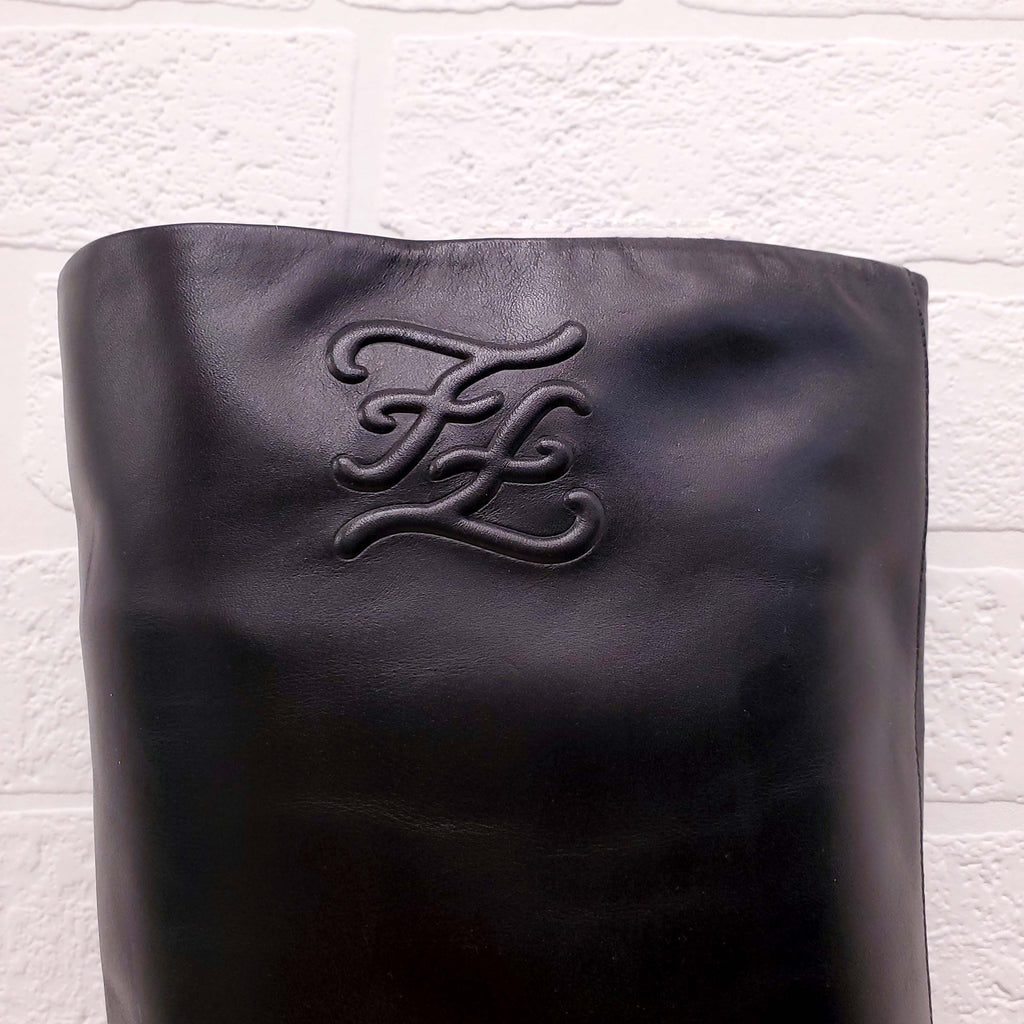 FENDI BLACK LEATHER KNEE HIGH 'KARLIGRAPHY' LOGO BOOTS - SIZE 39