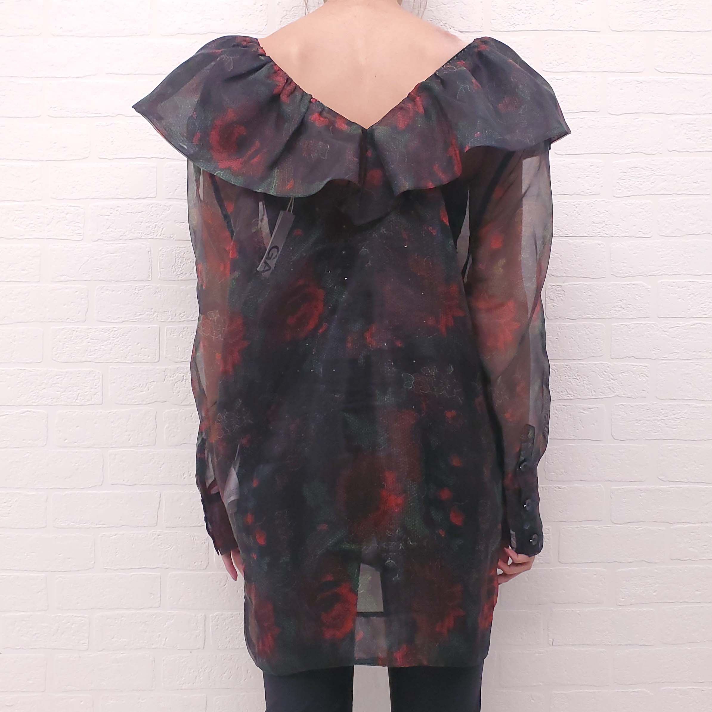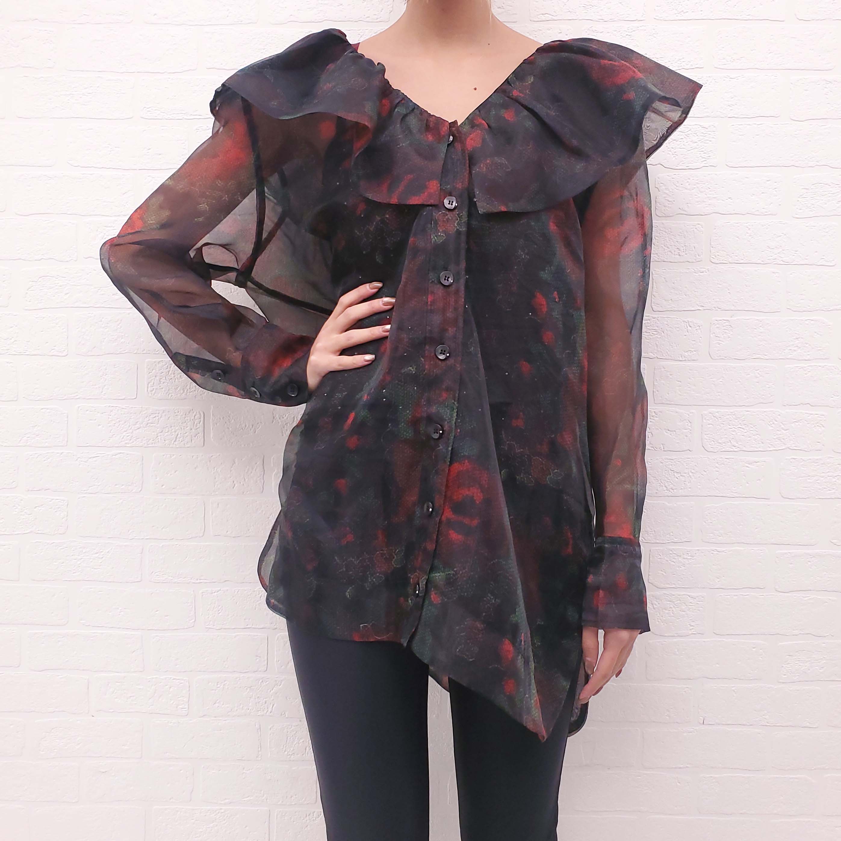 GANNI BLACK FLORAL SHEER BLOUSE WITH RUFFLE COLLAR - SIZE 40