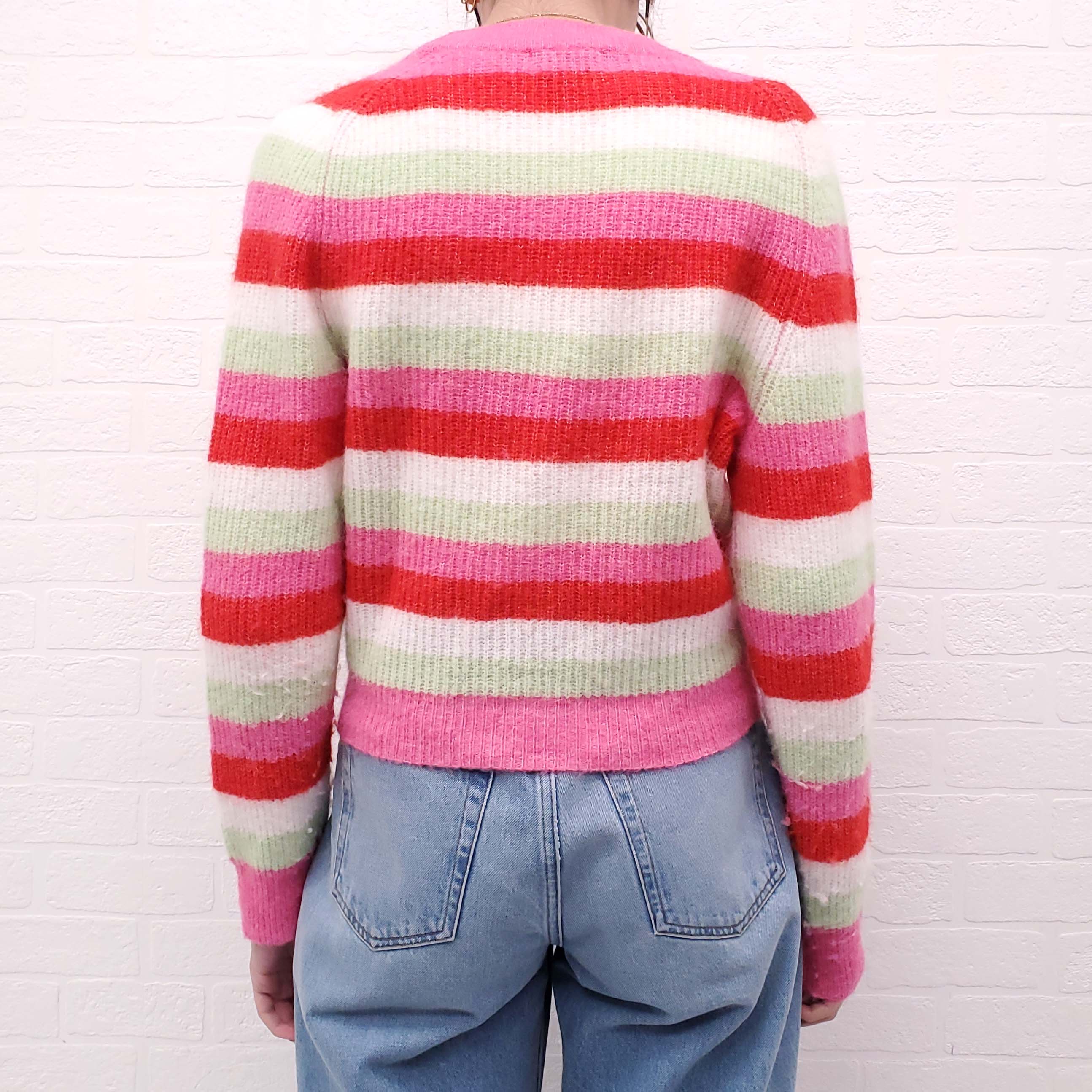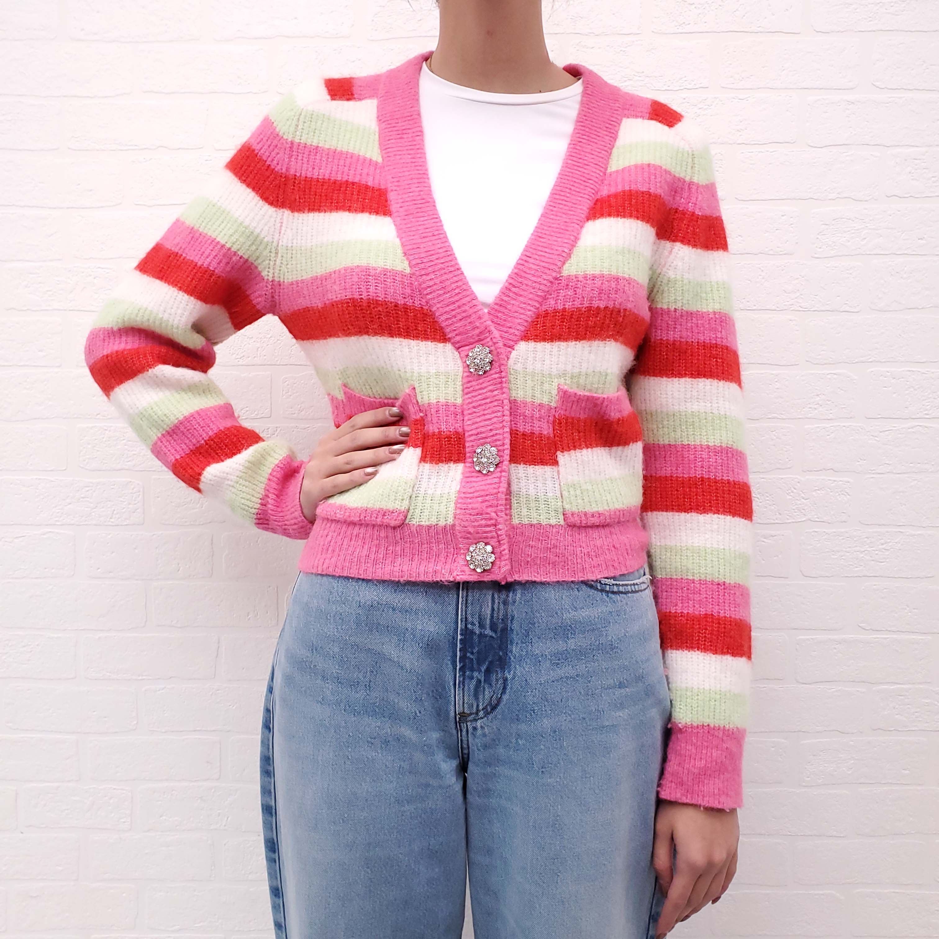 GANNI OVERSIZED RED, PINK AND GREEN STRIPED CARDIGAN WITH CRYSTAL BUTTONS - SIZE XXS