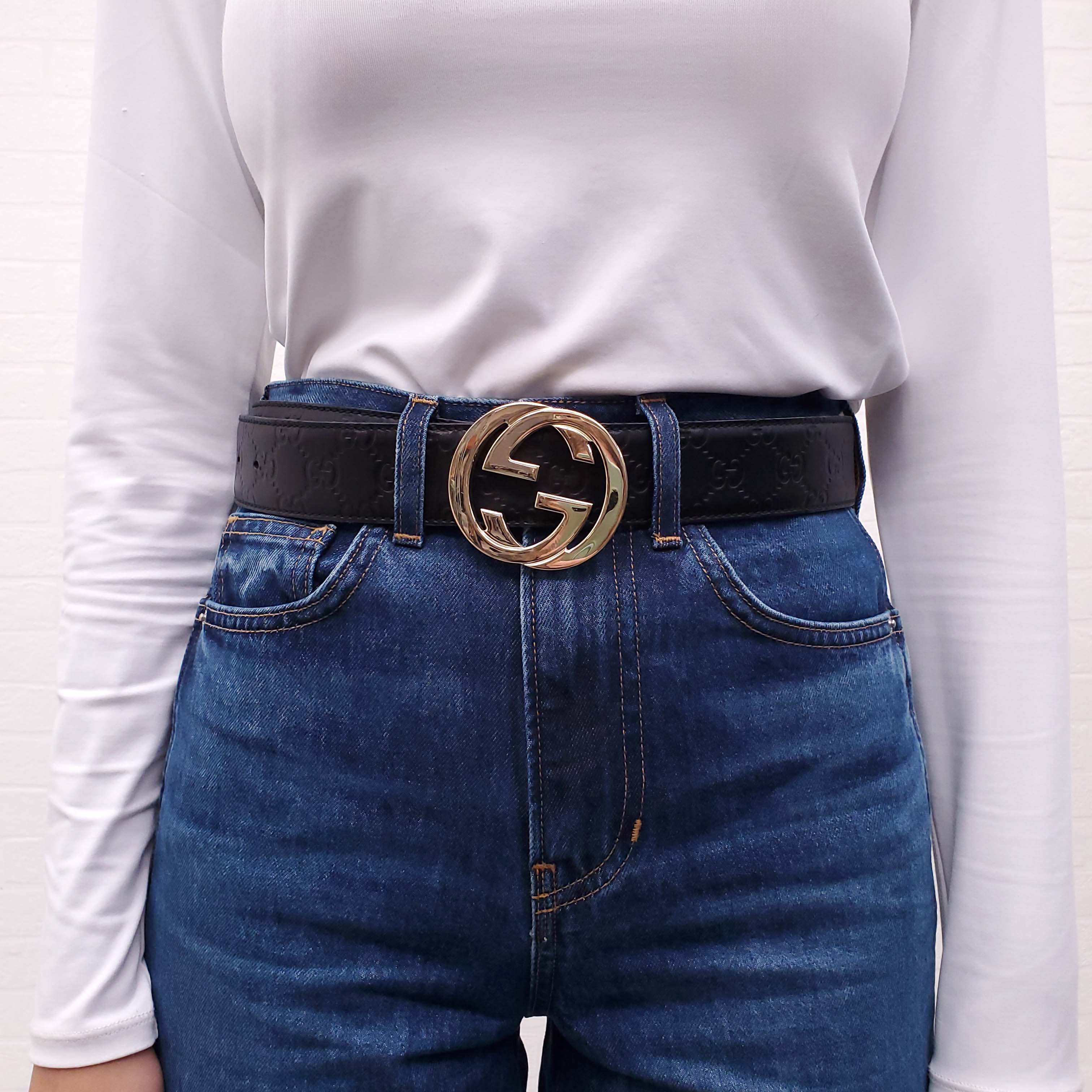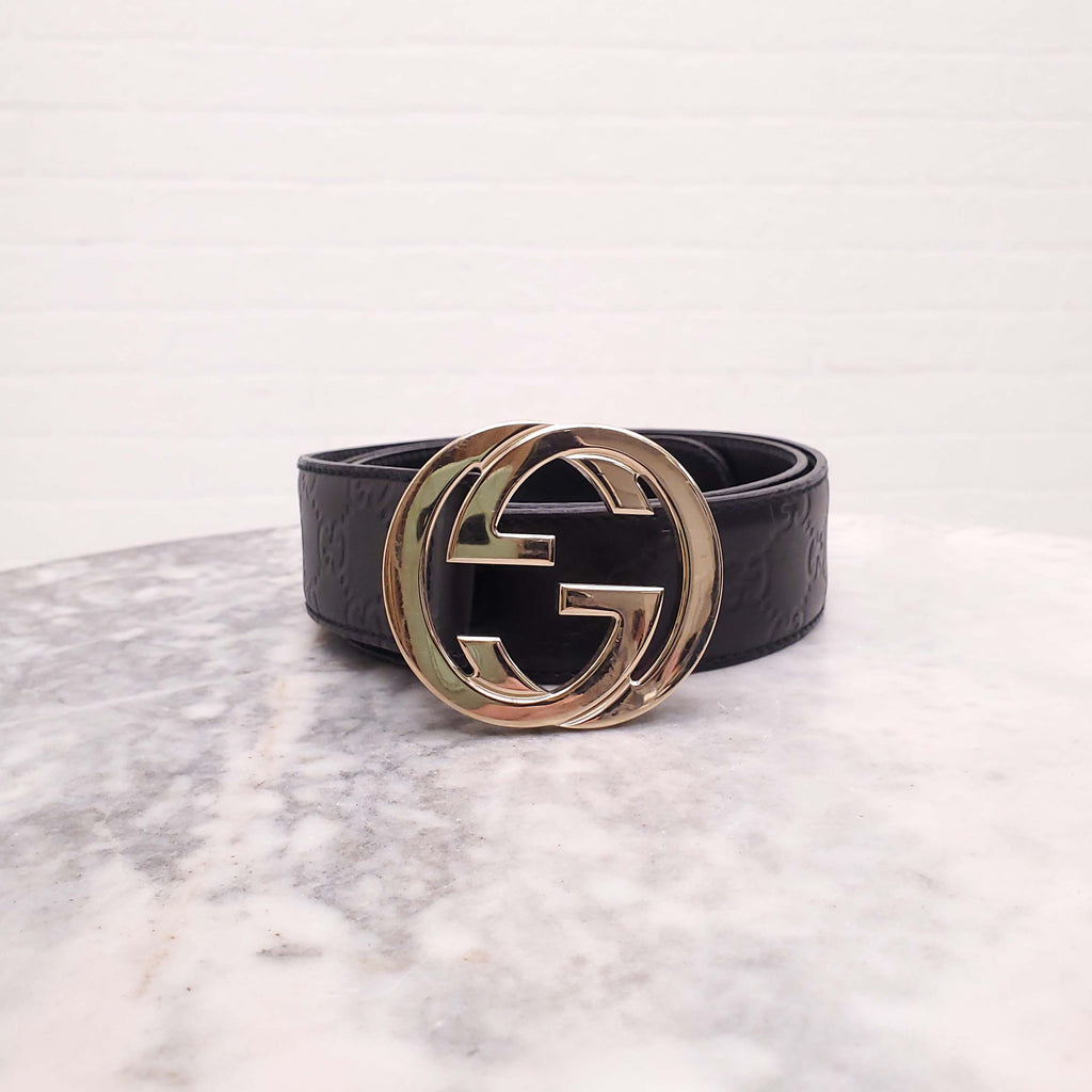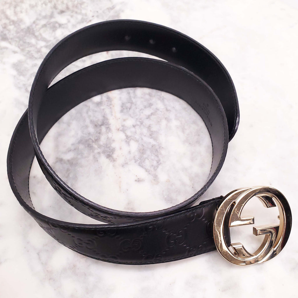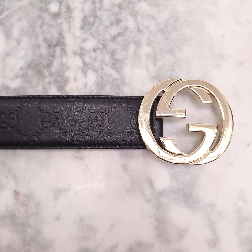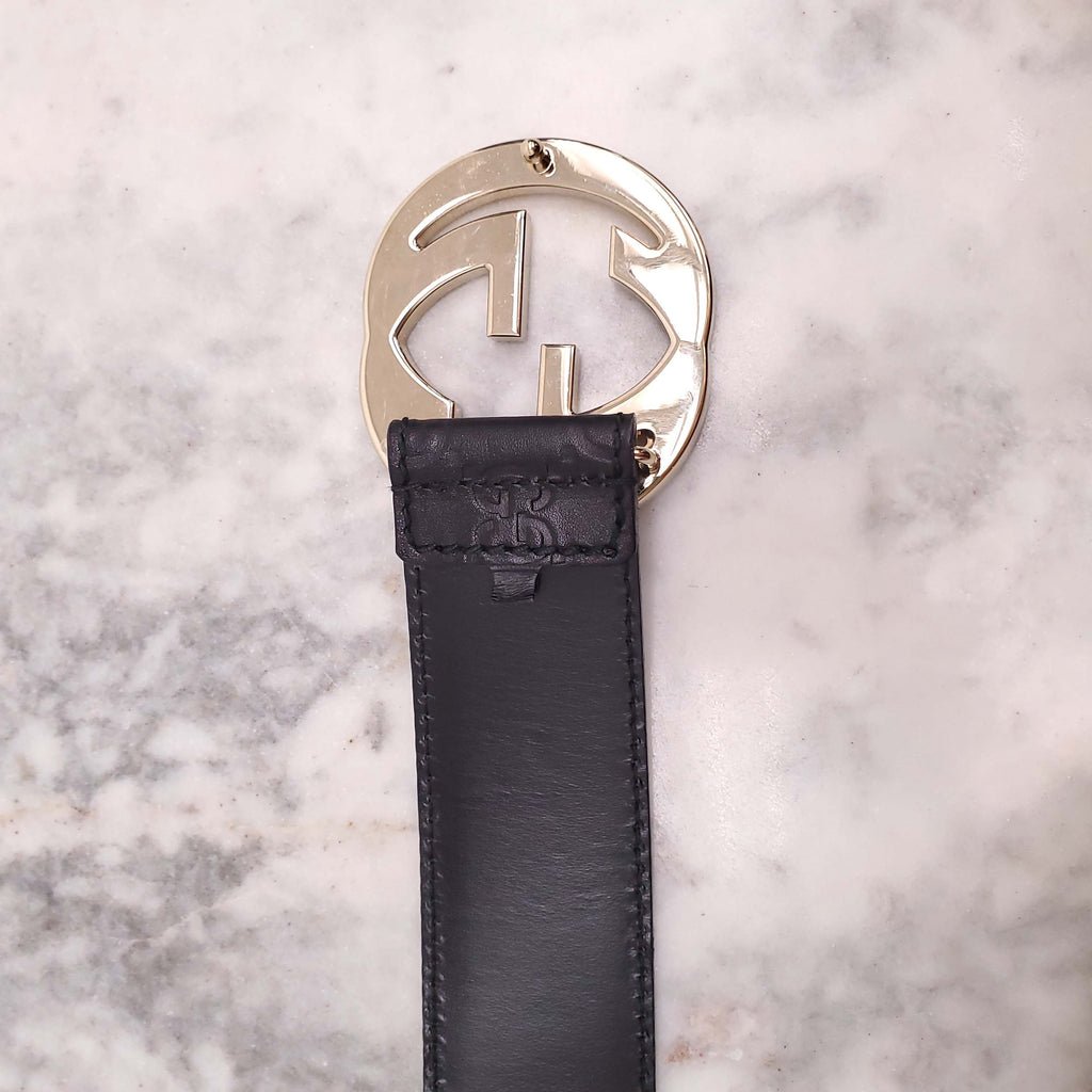 GUCCI BLACK LEATHER MONOGRAM LOGO BELT - SIZE 95