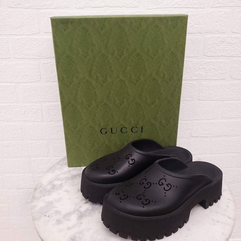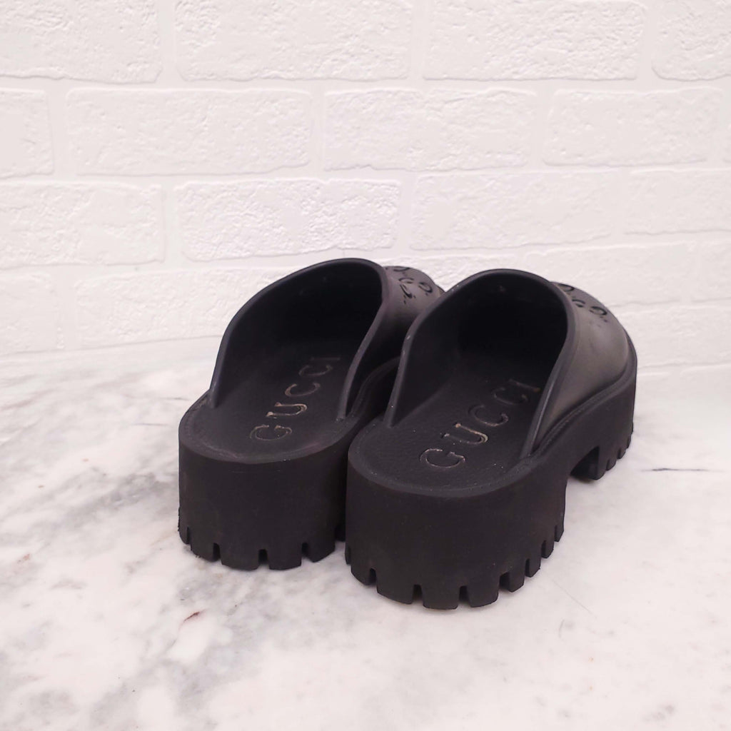 GUCCI BLACK RUBBER LOGO CLOGS - SIZE 39