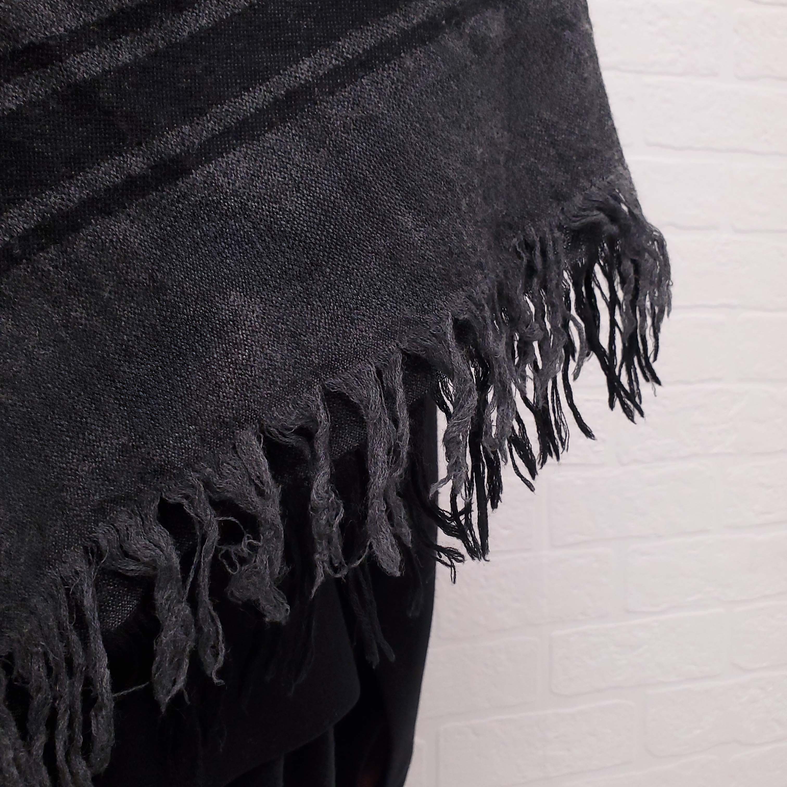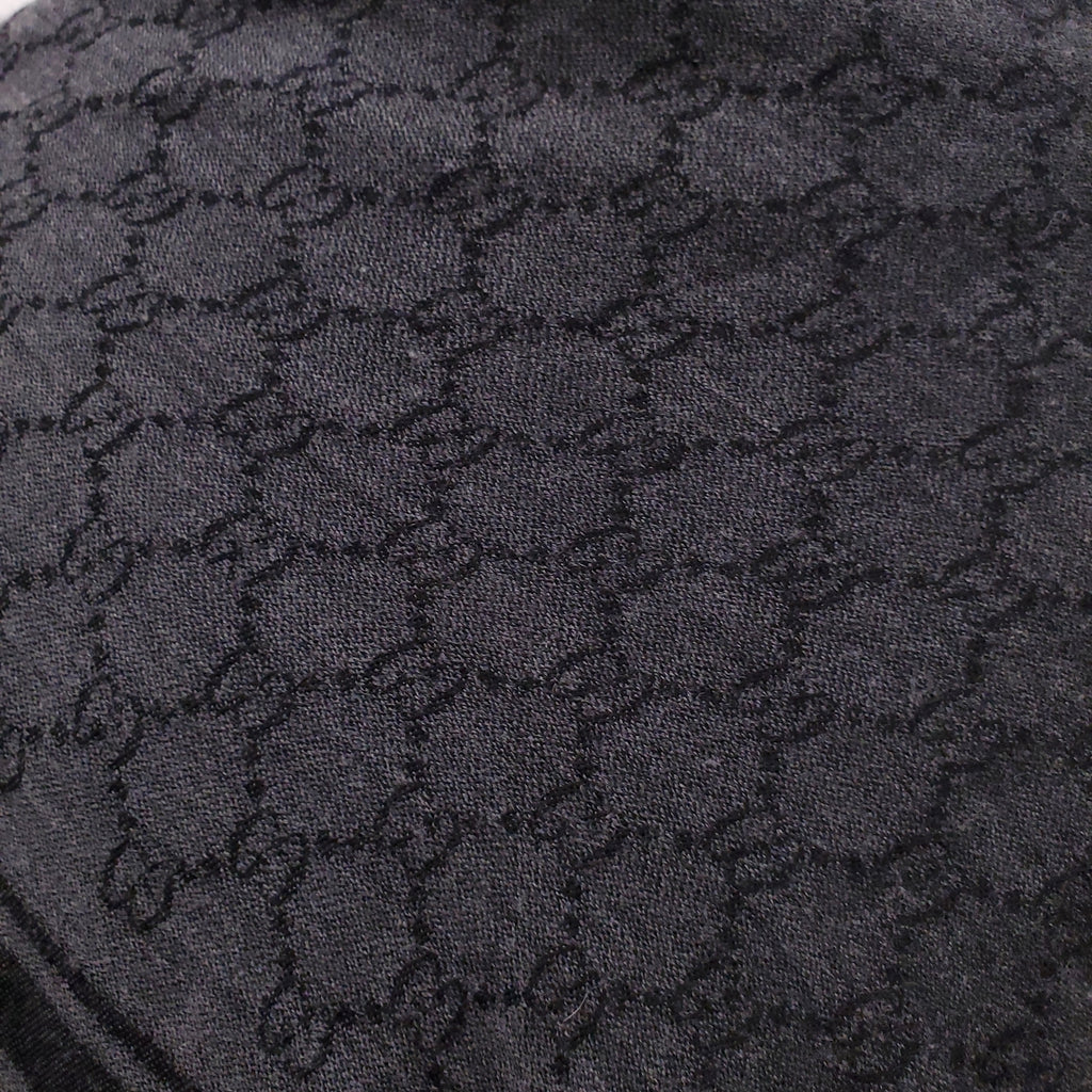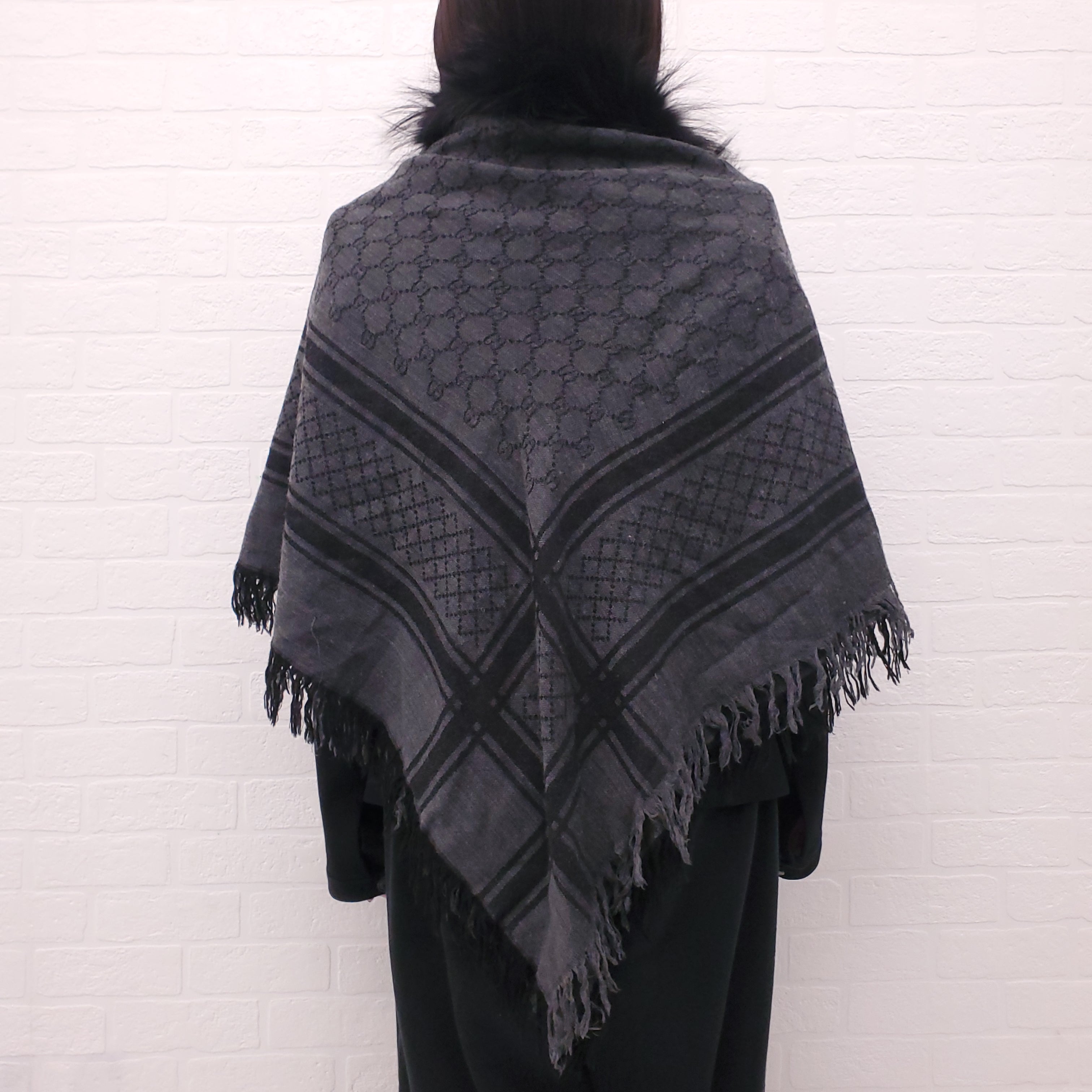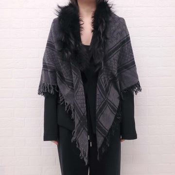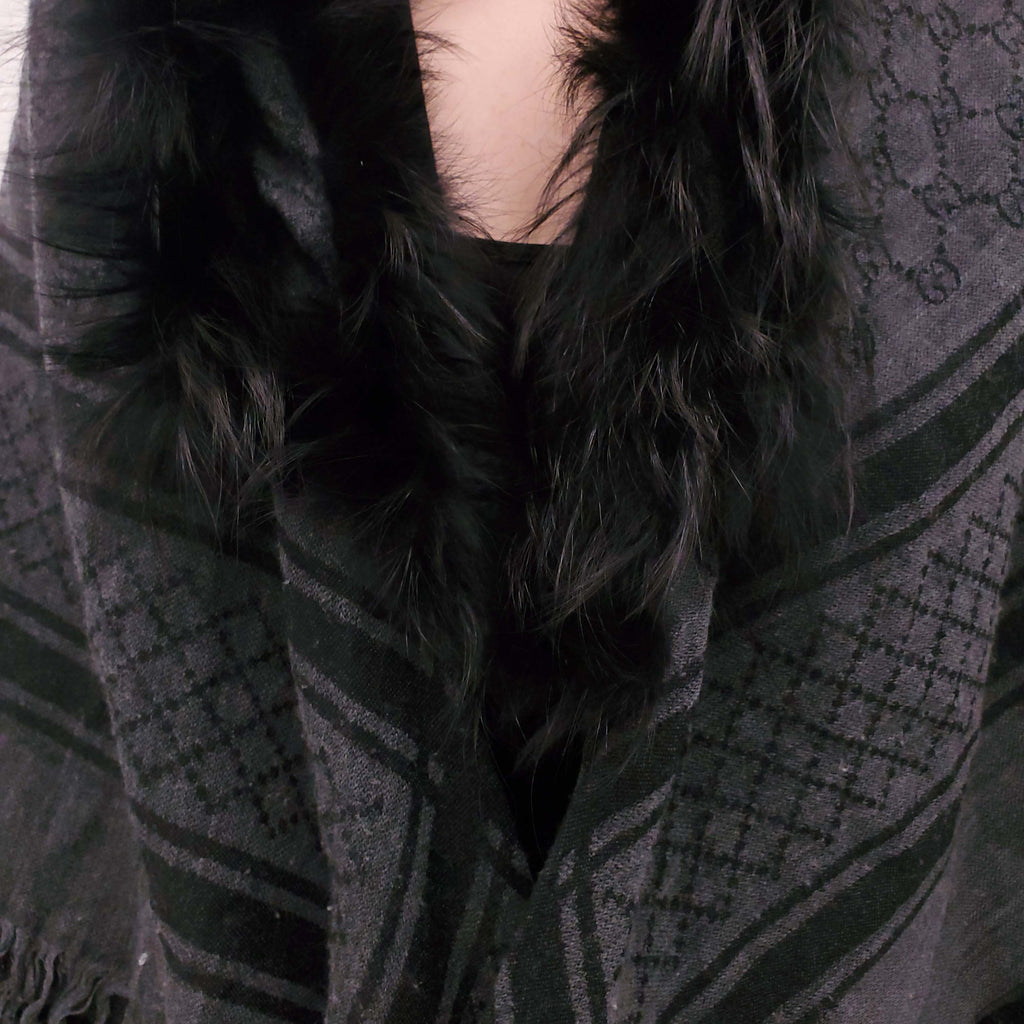GUCCI CHARCOAL GREY AND BLACK LOGO SCARF WITH FOX FUR
