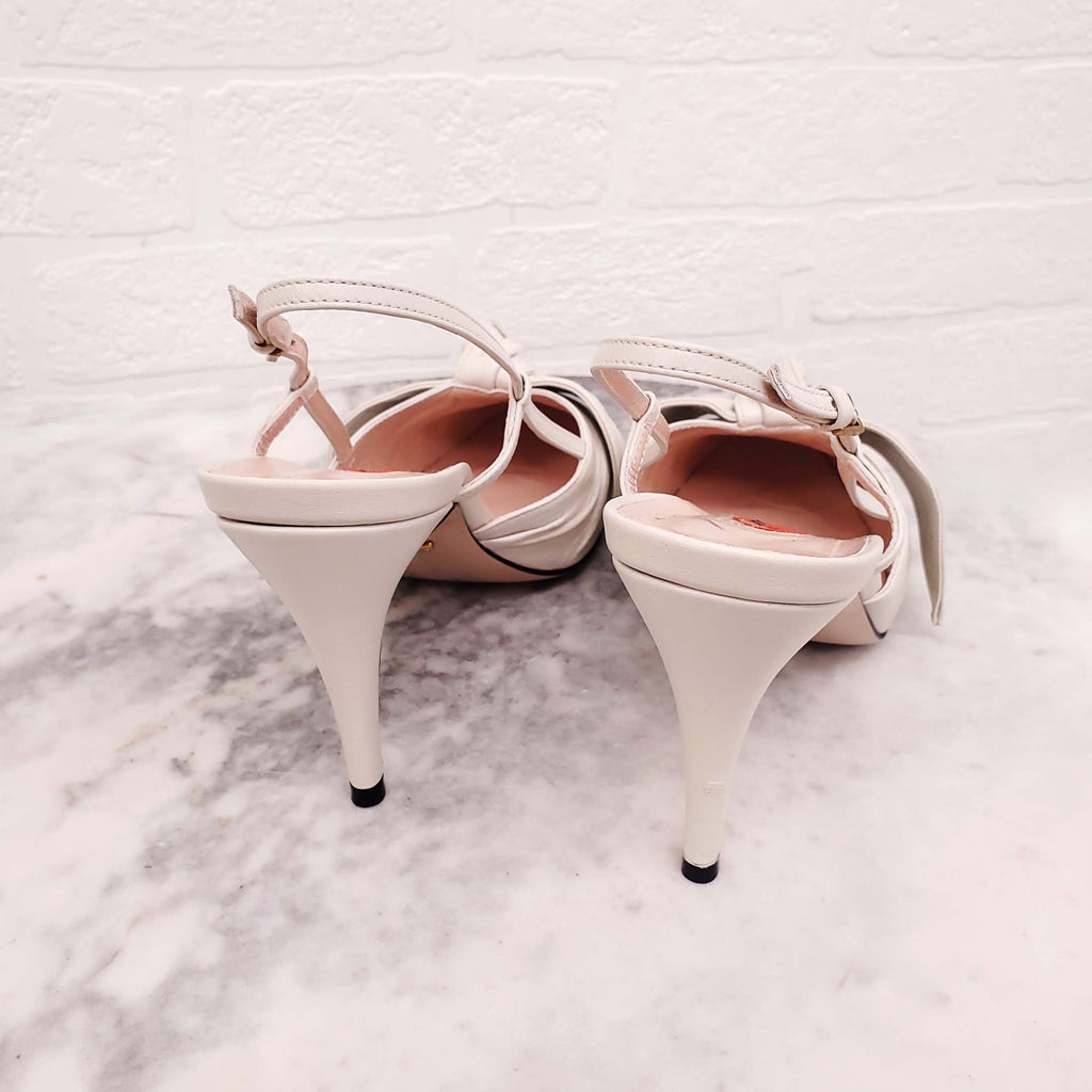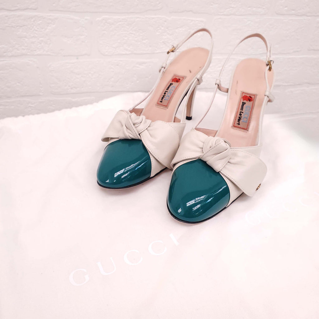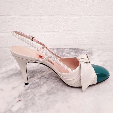 GUCCI CREAM BOW AND PATENT GREEN CAP TOE SLINGBACK HEELS - SIZE 39