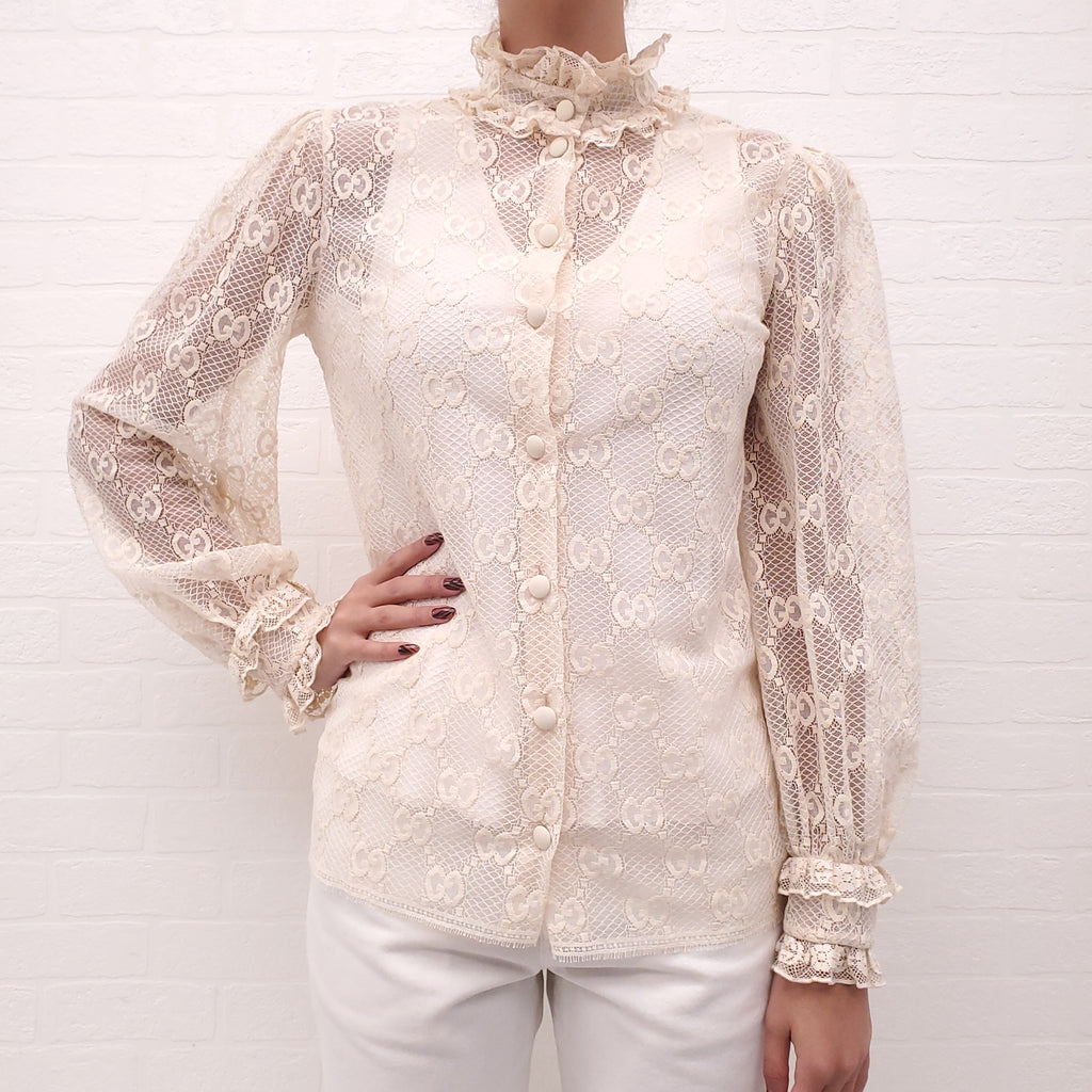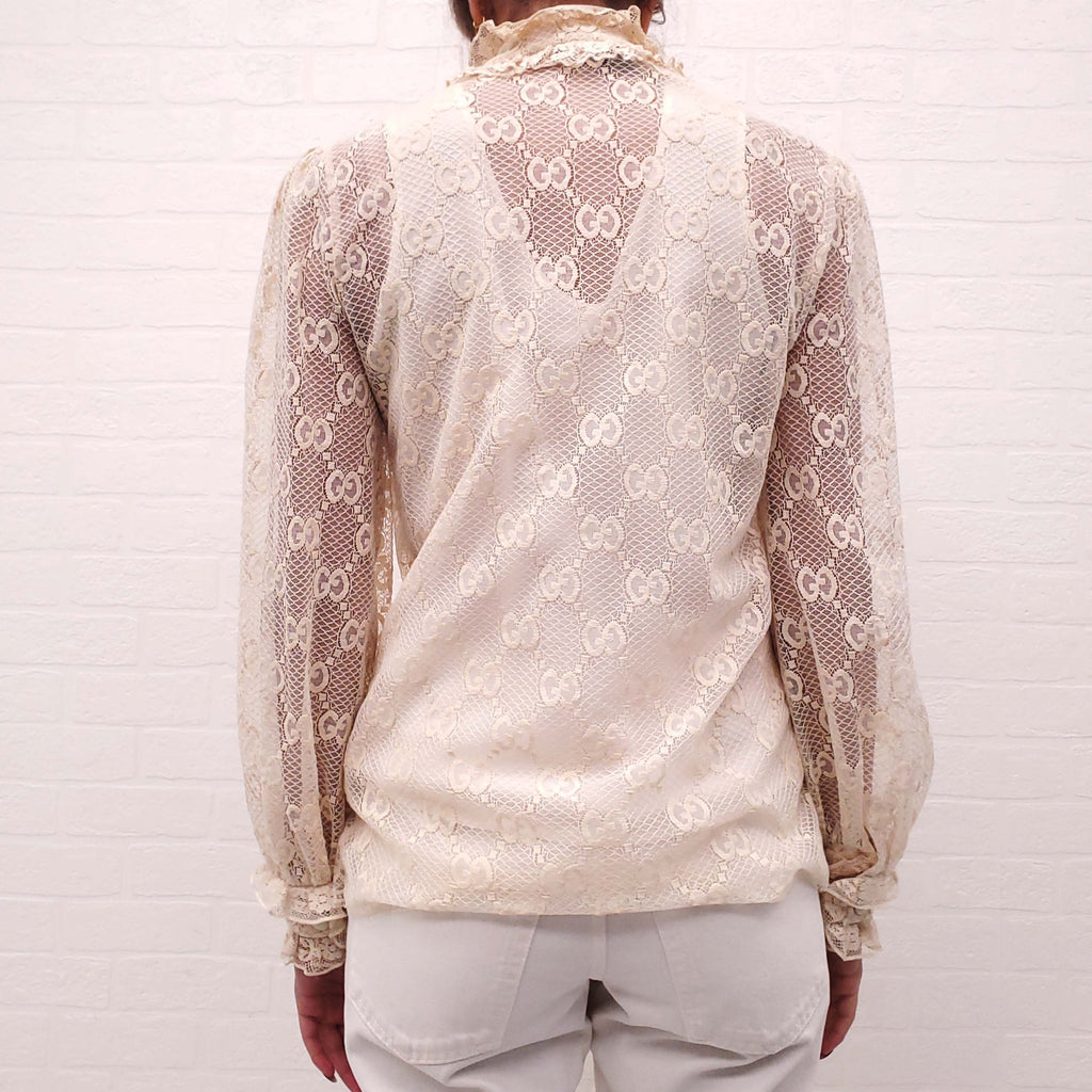 GUCCI CREAM LOGO LACE BLOUSE - SIZE 40