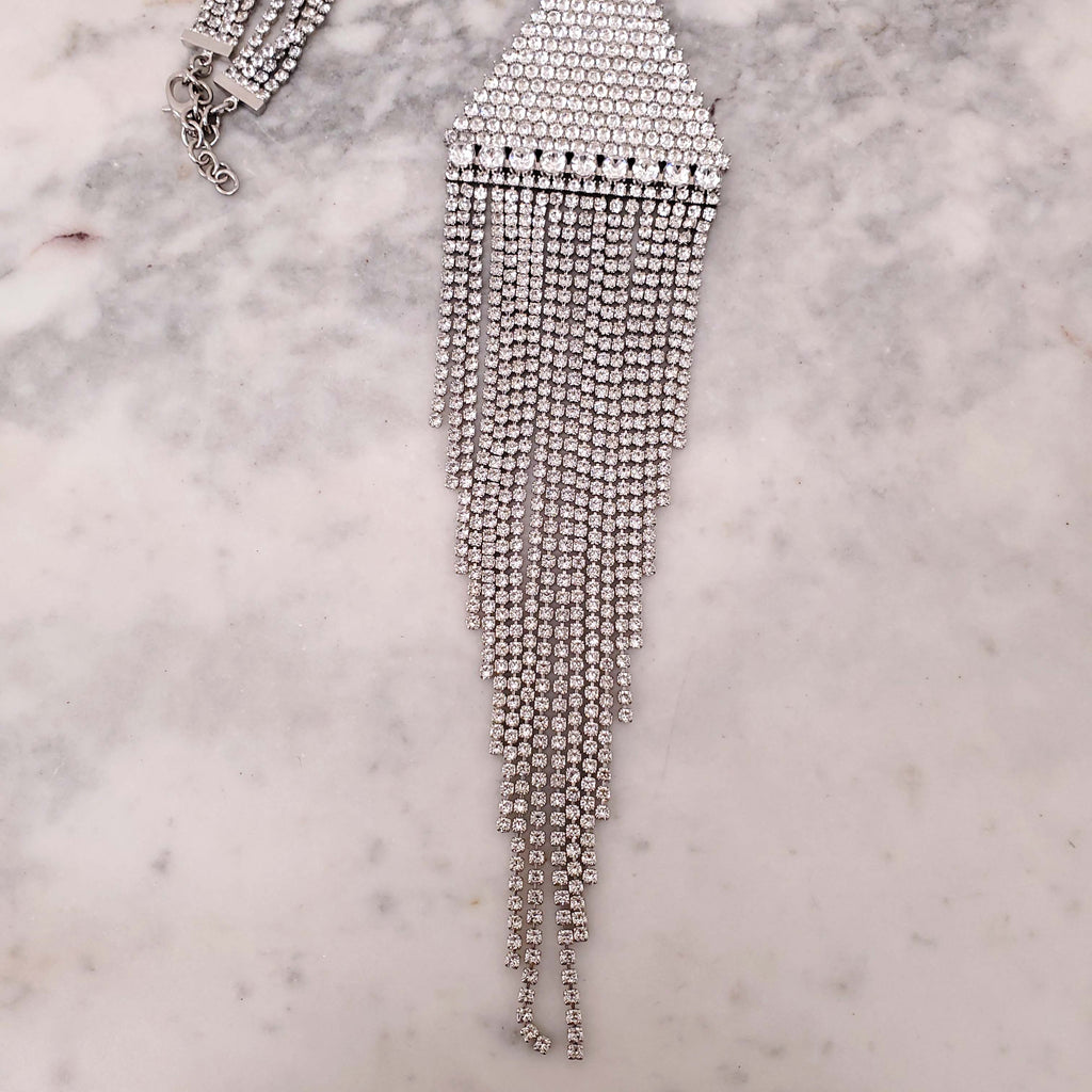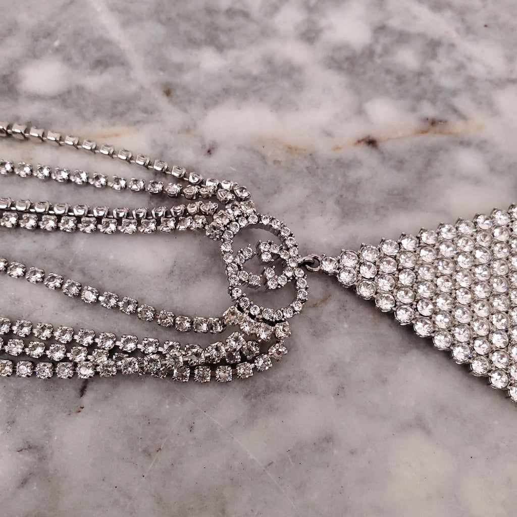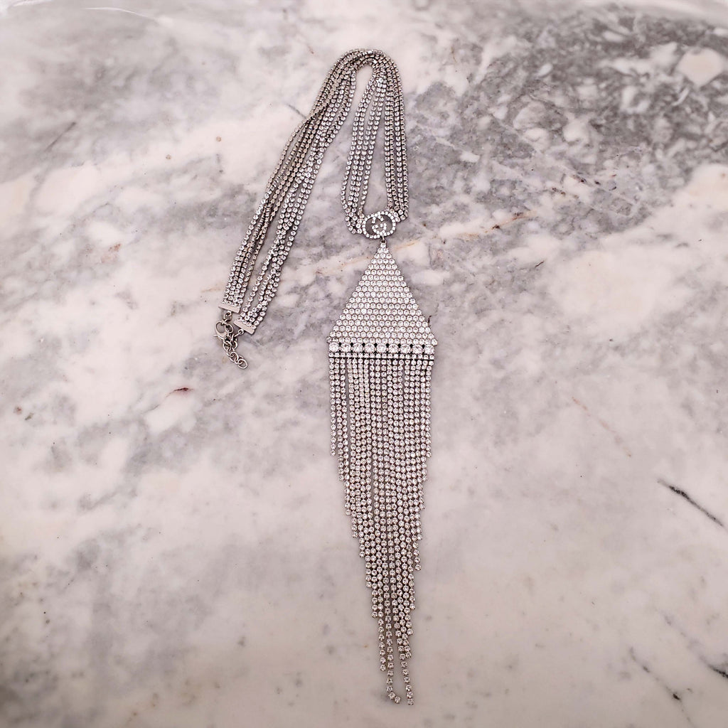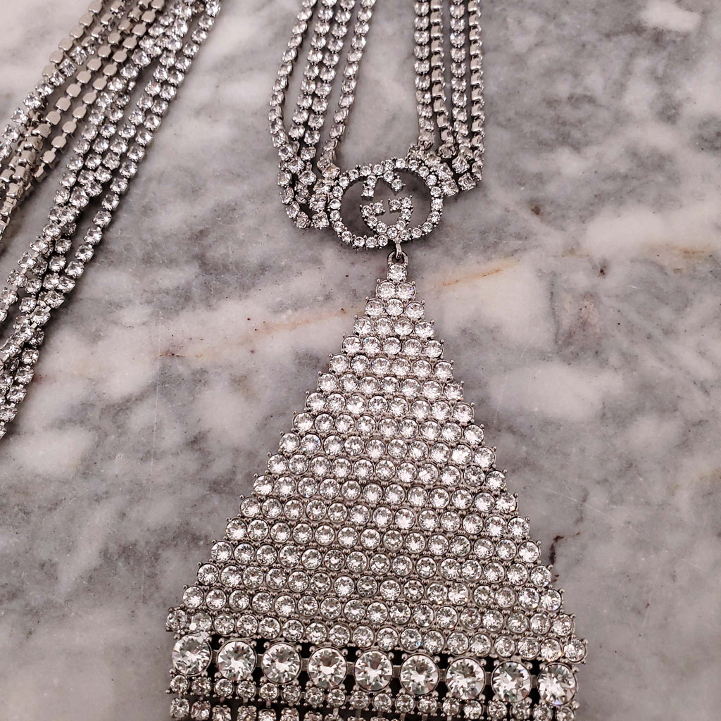 GUCCI CRYSTAL LOGO TRIANGLE FRINGE NECKLACE