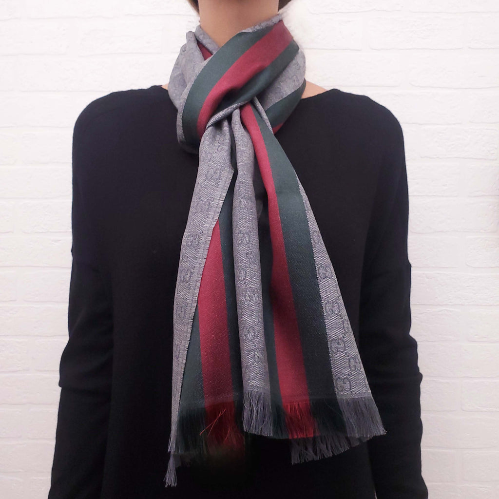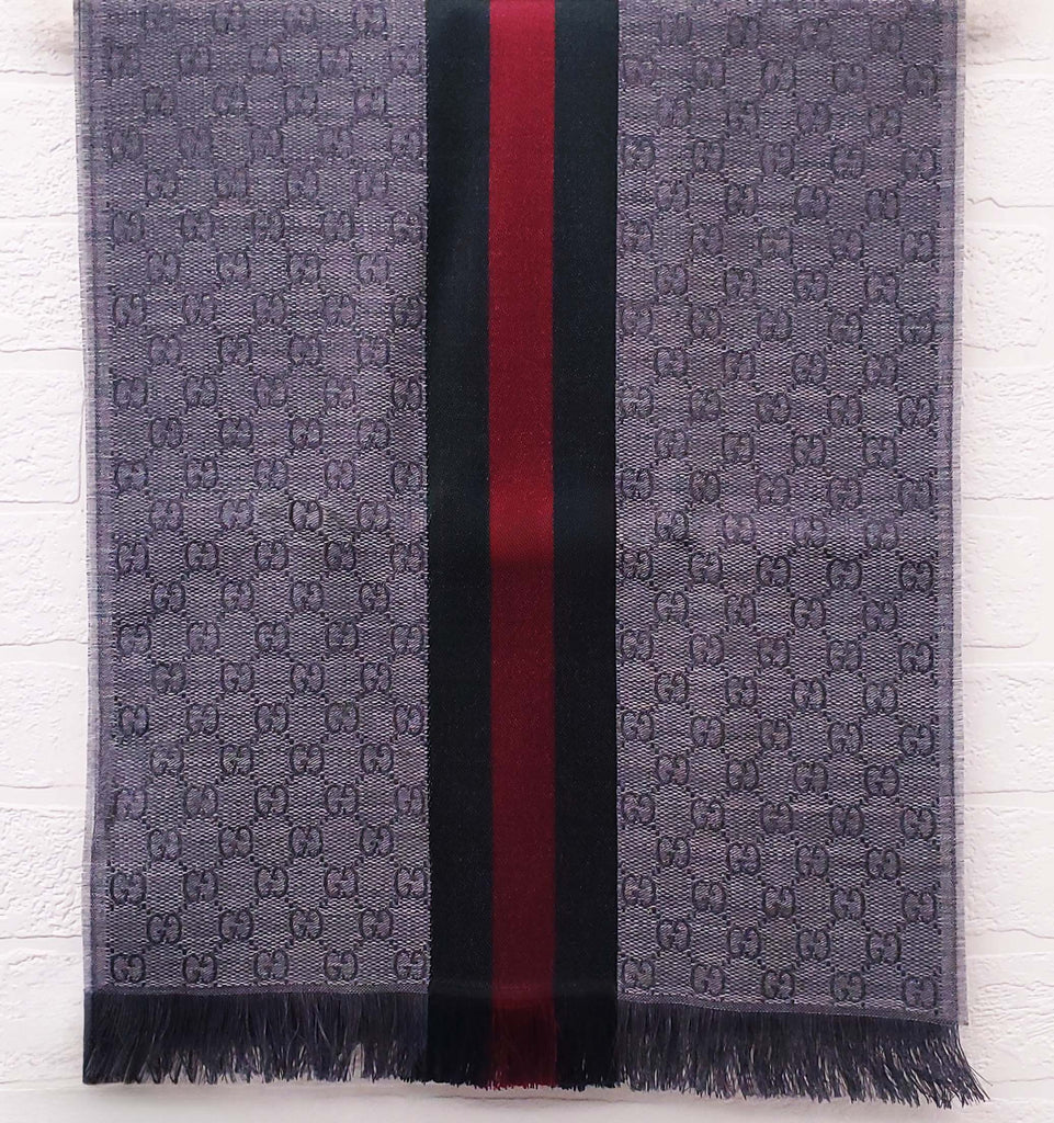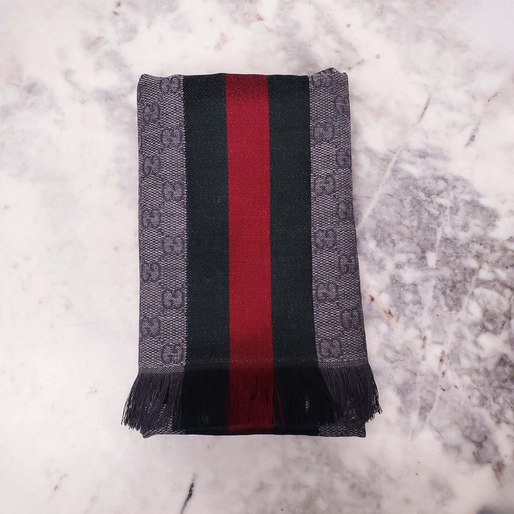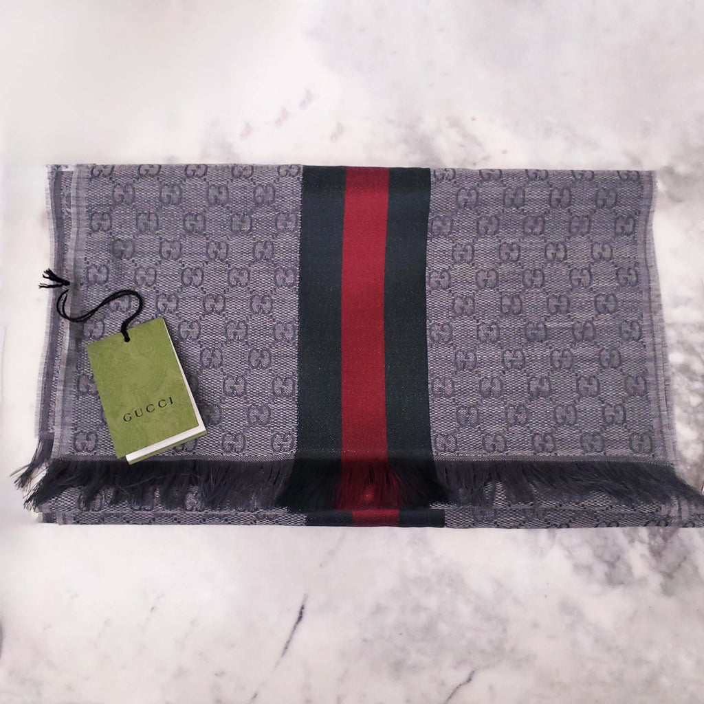 GUCCI GREY LOGO SCARF WITH WEB DETAIL