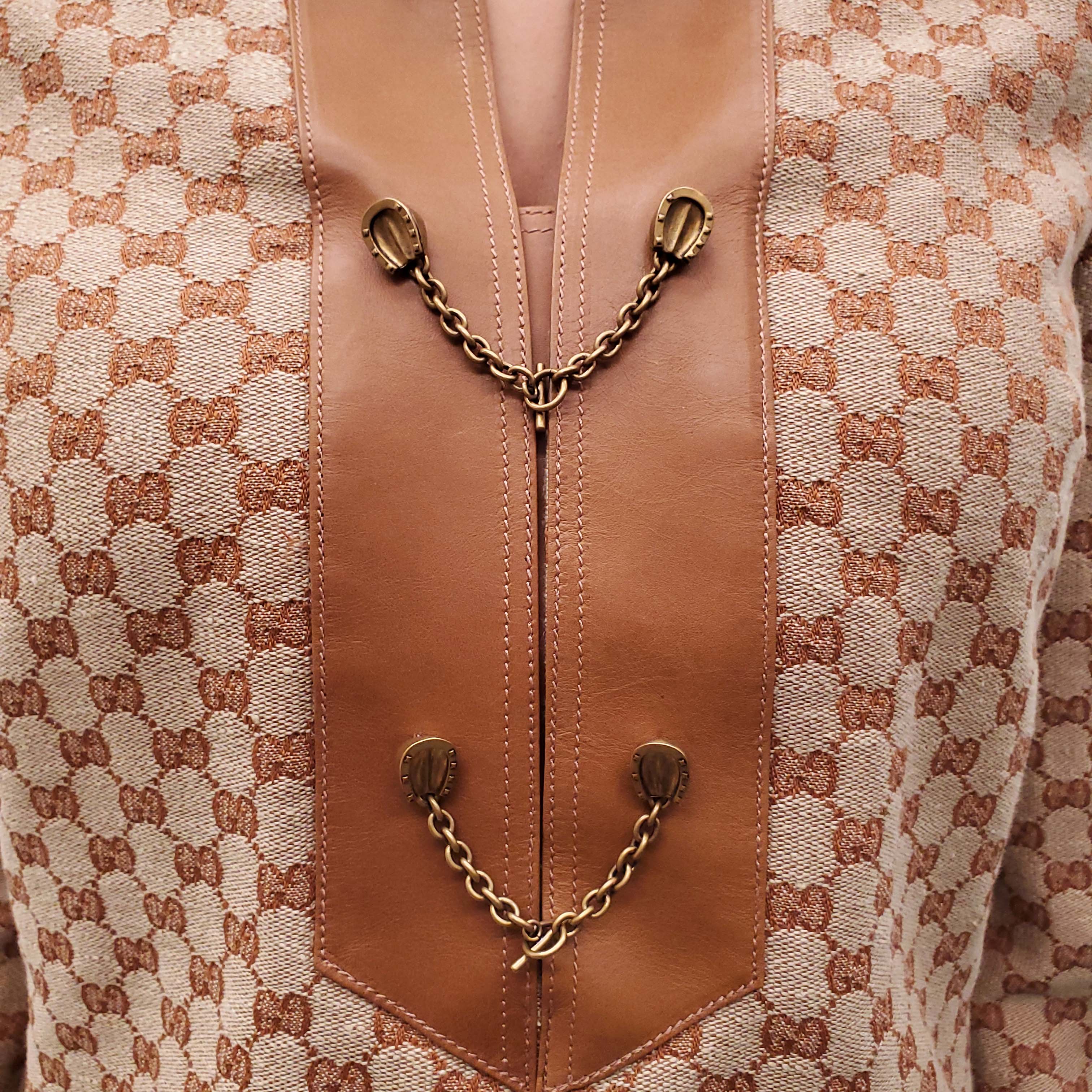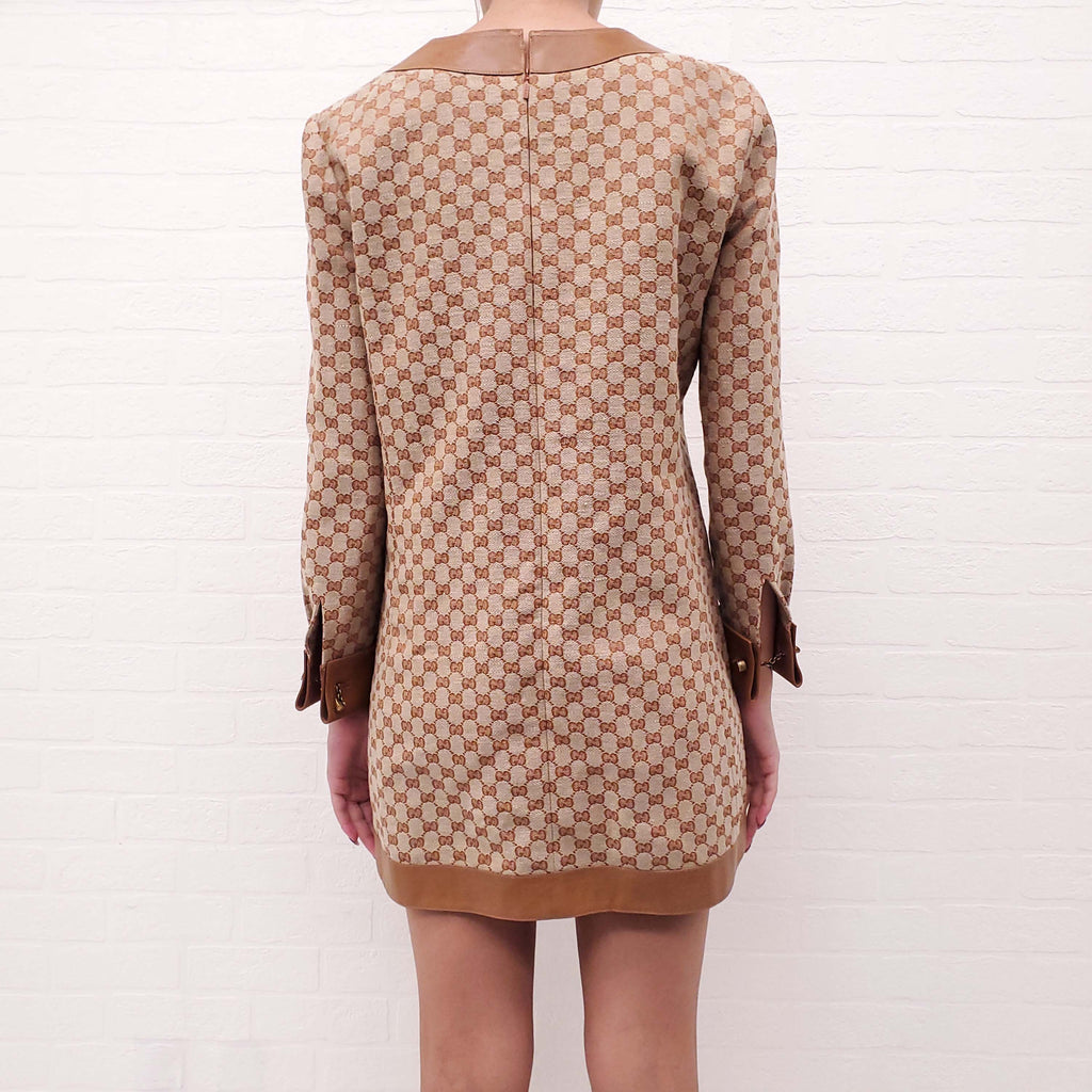 GUCCI 'LIGHT LINEN CANVAS GG WITH TAN LEATHER' DRESS - SIZE 40