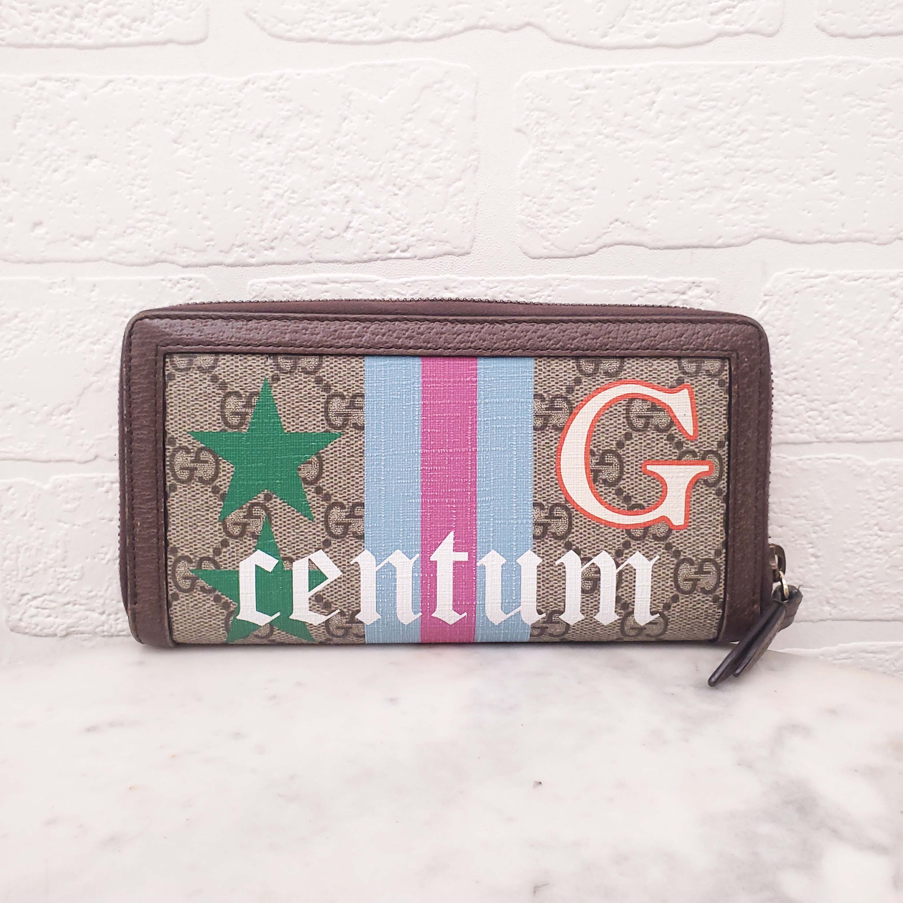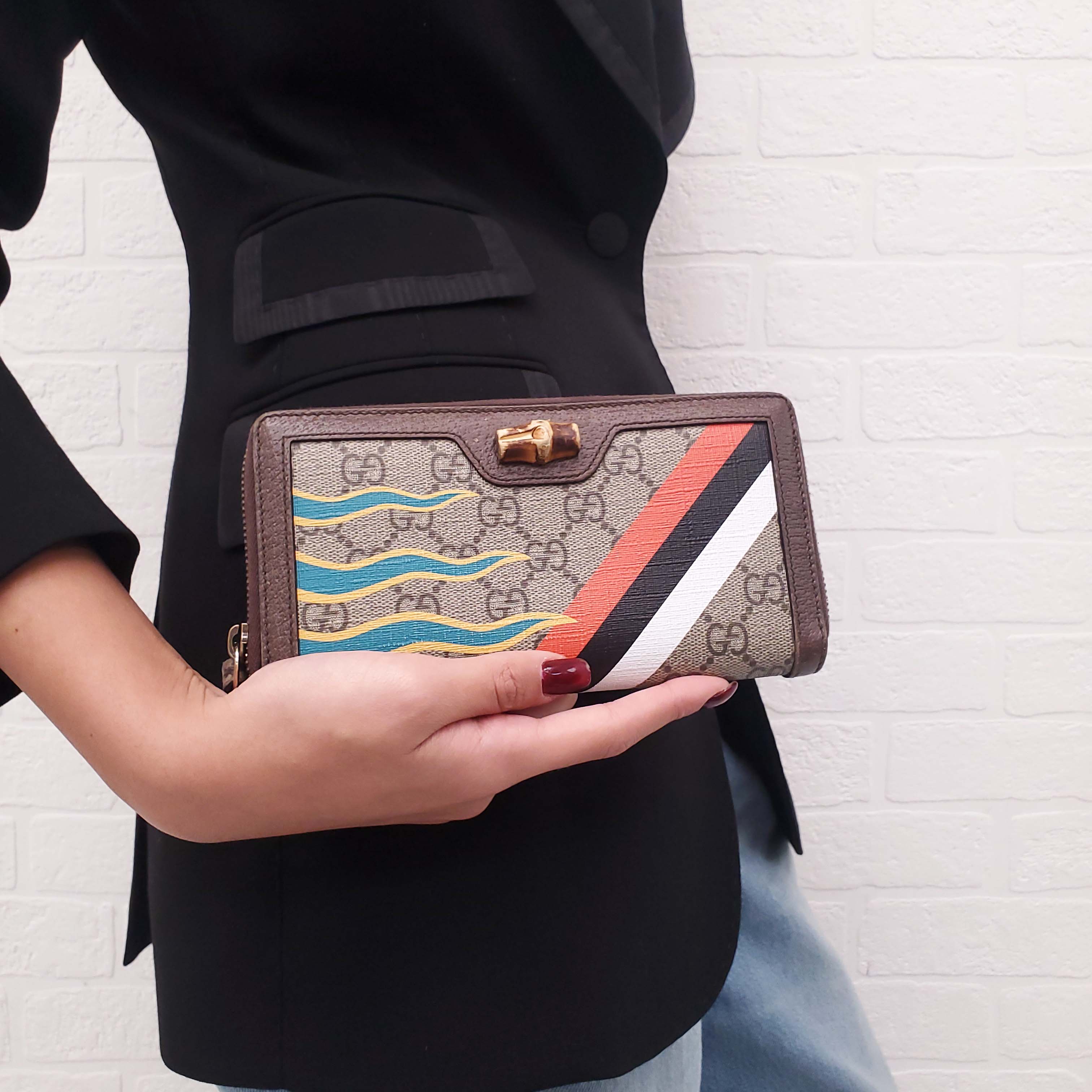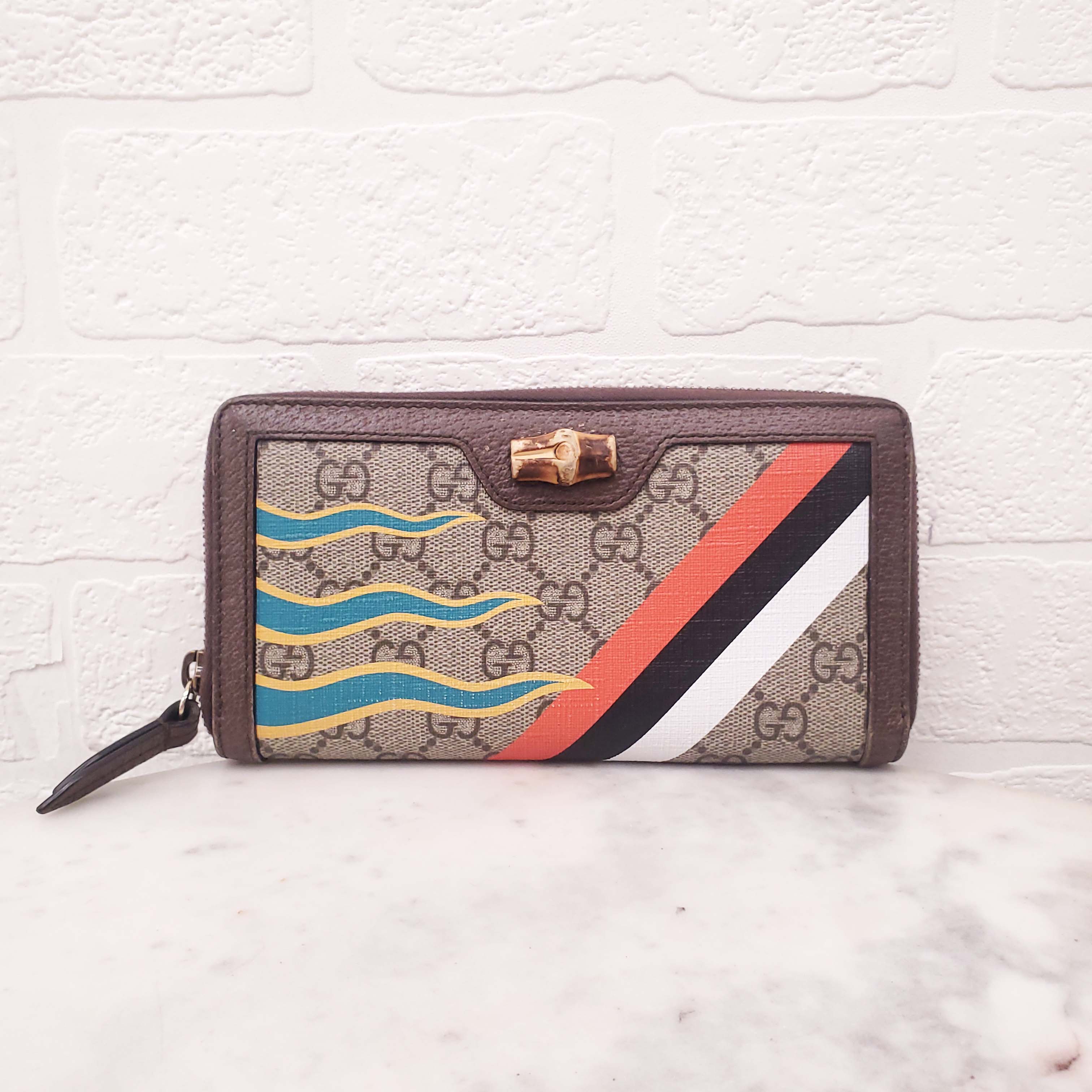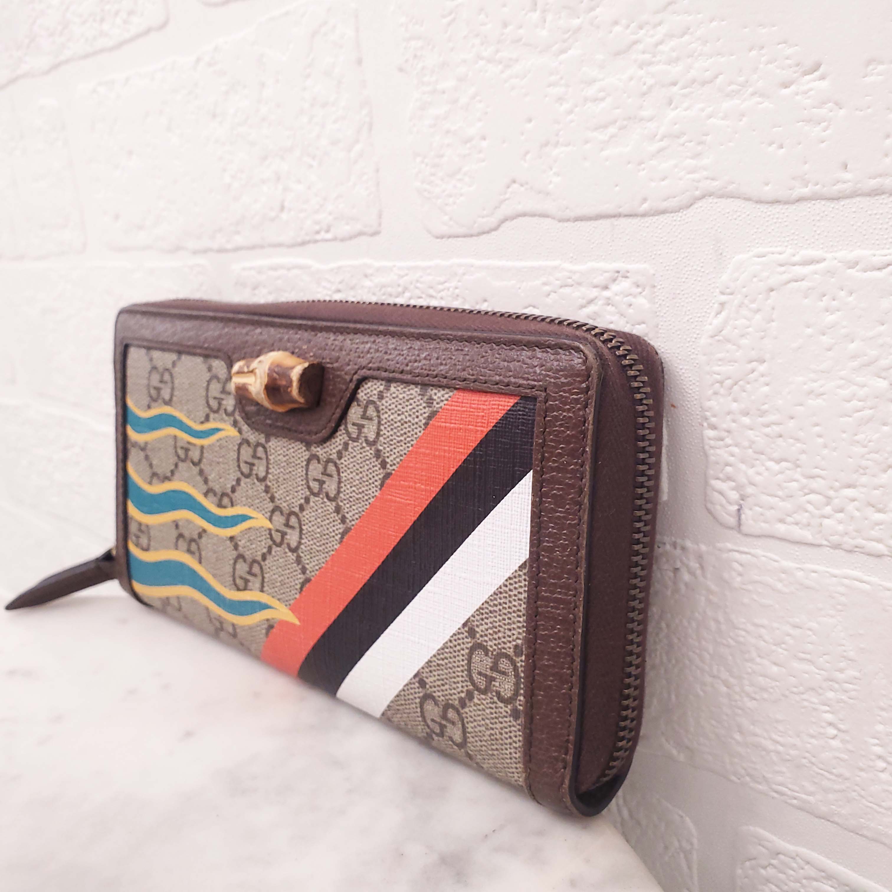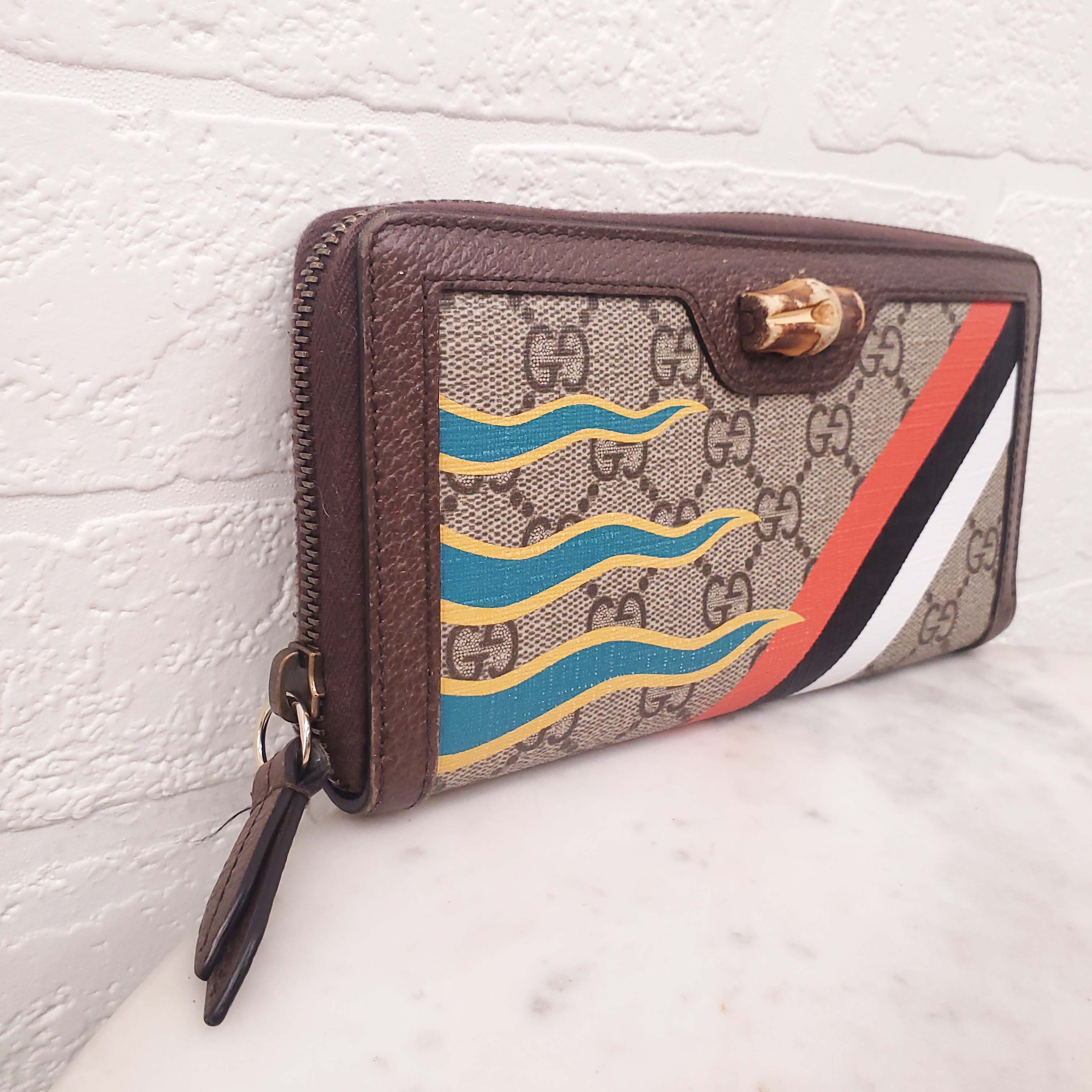 GUCCI MONOGRAM ZIP AROUND WALLET WITH BAMBOO DETAIL