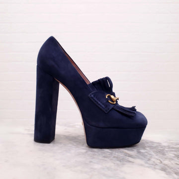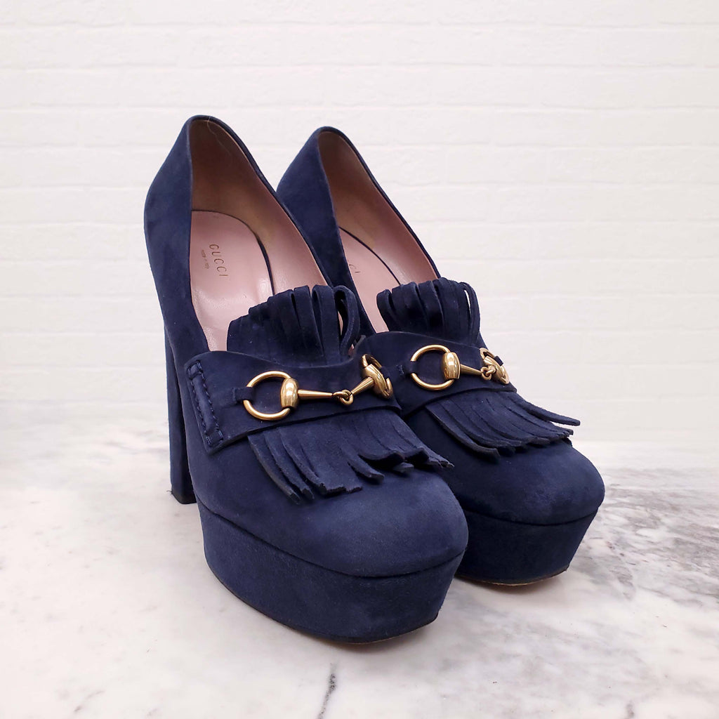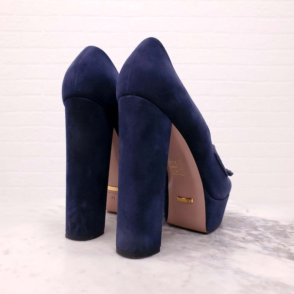 GUCCI NAVY SUEDE HORSEBIT LOAFERS WITH BLACK HEEL - SIZE 41