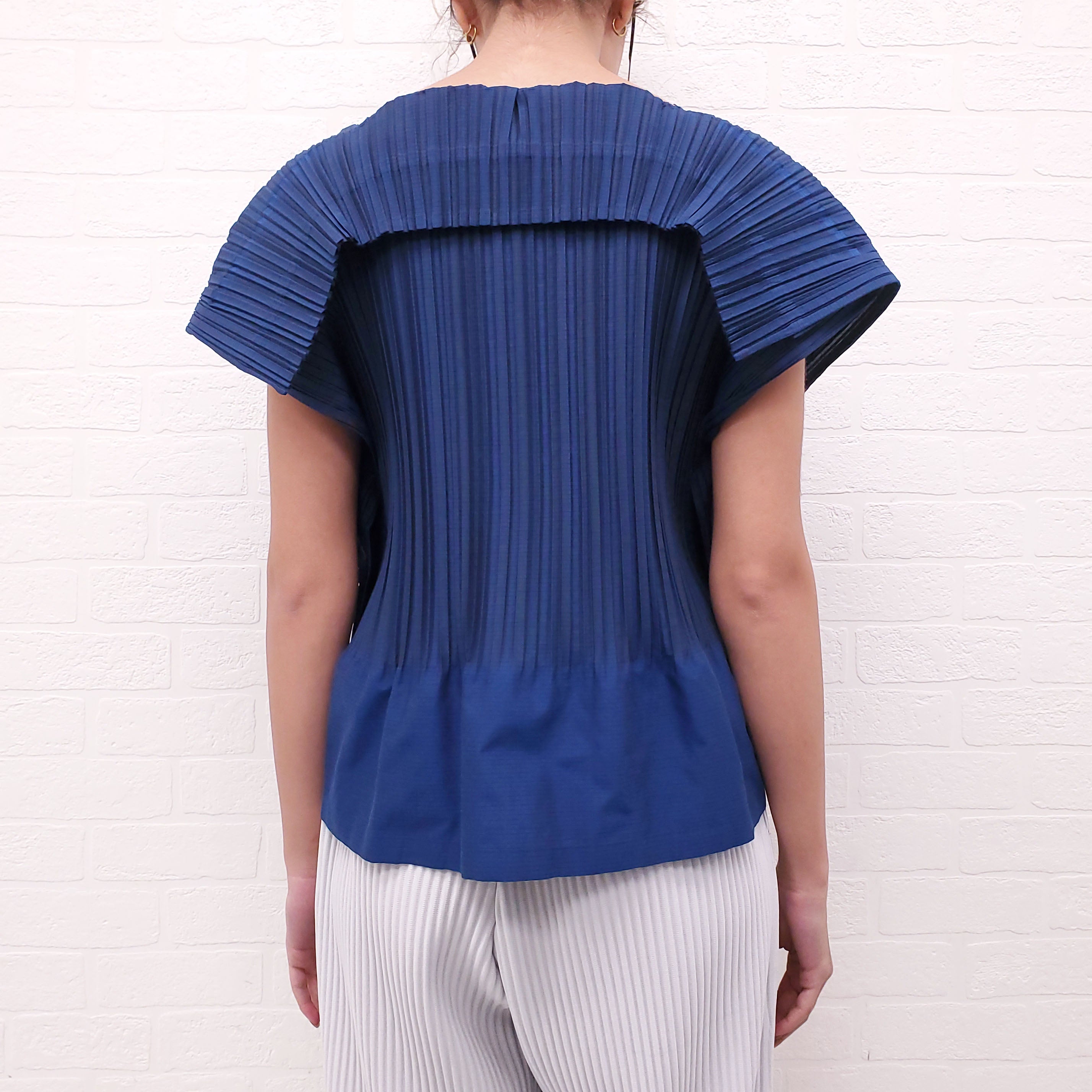ISSEY MIYAKE BLUE PLEATED SHORT SLEEVE BLOUSE - SIZE 2/S