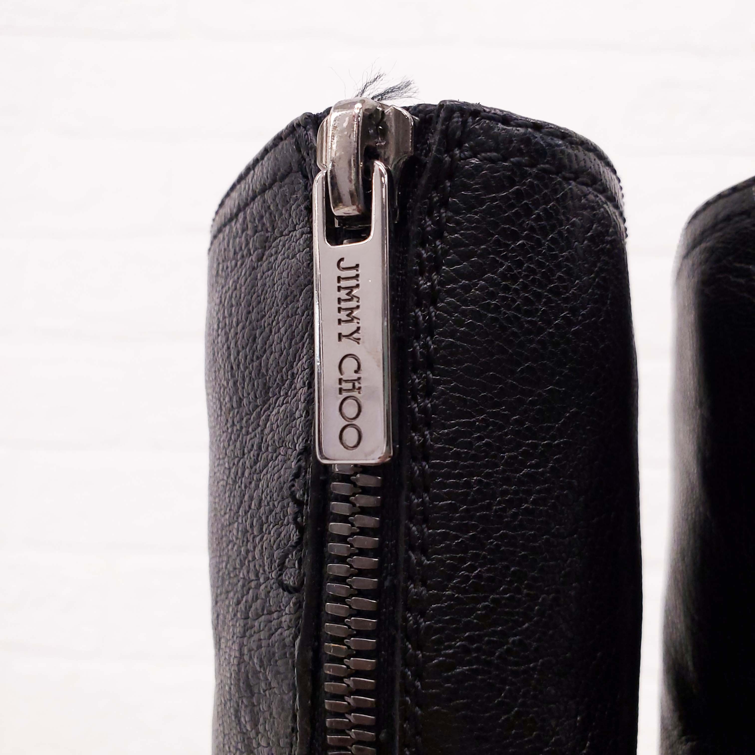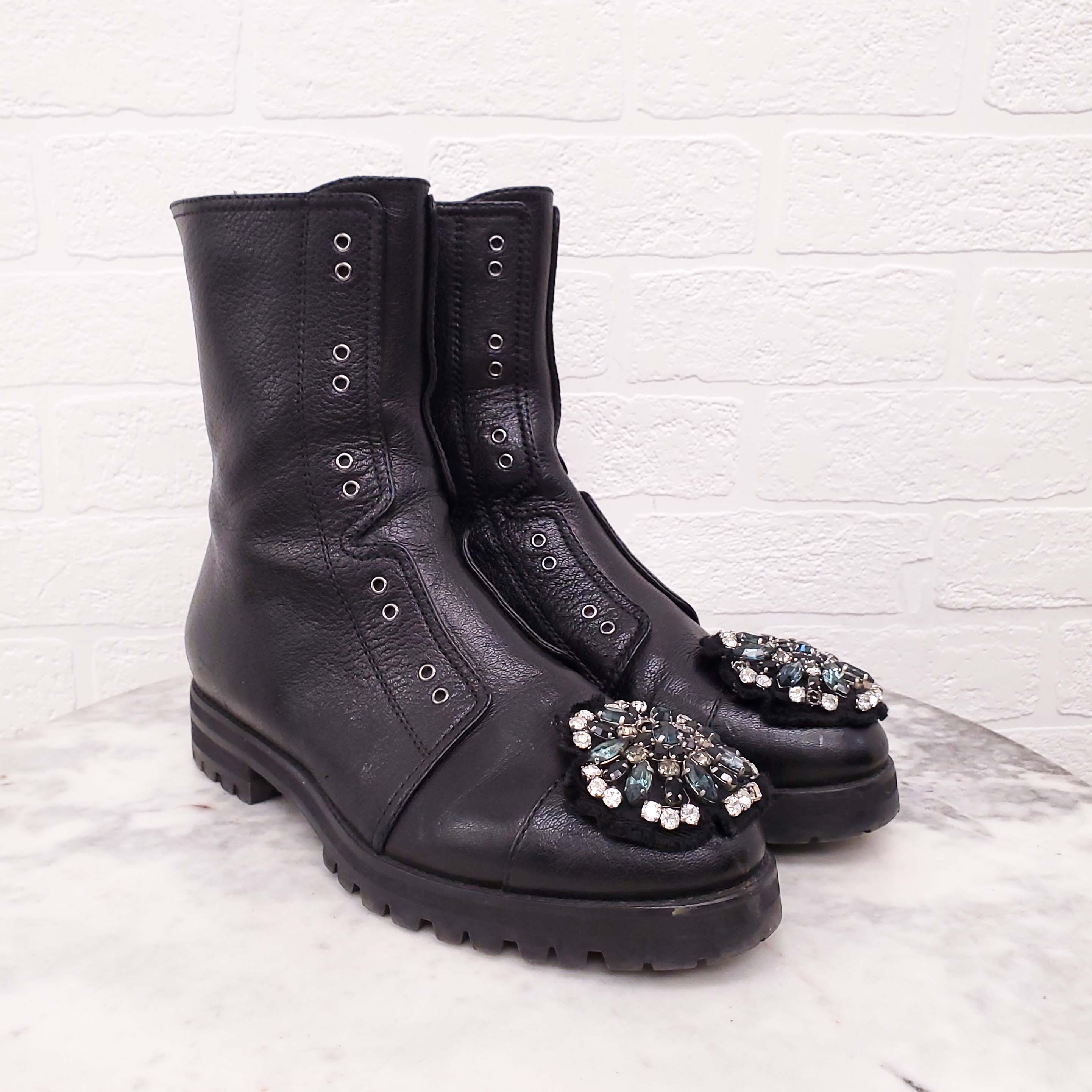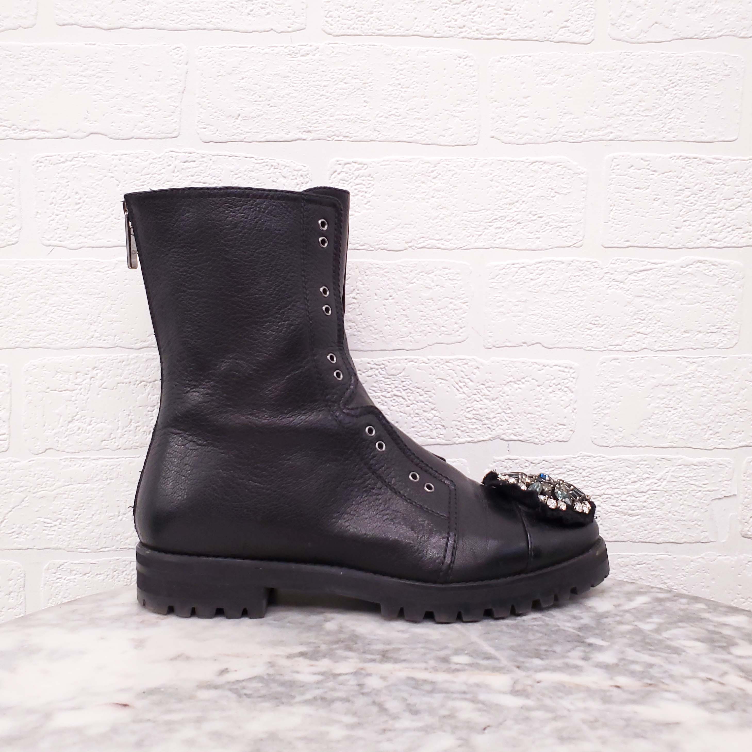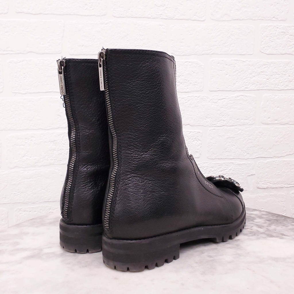 JIMMY CHOO BLACK LEATHER MOTORCYCLE BOOTS WITH CRYSTAL EMBLEM - SIZE 38