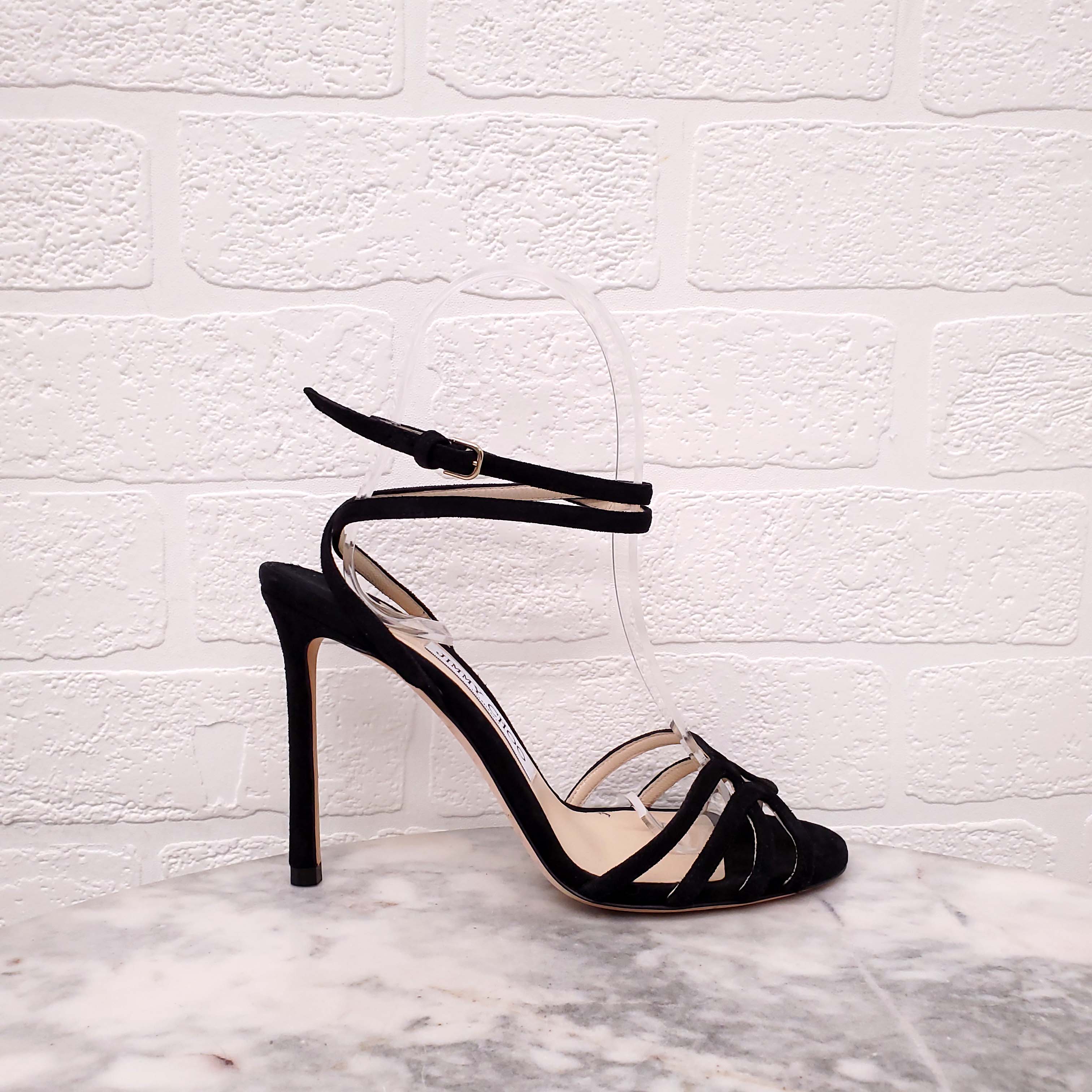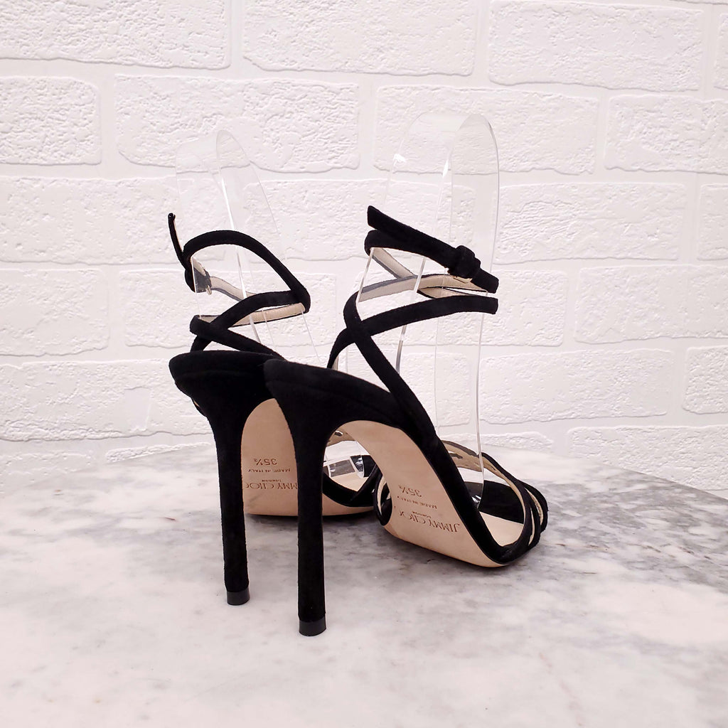 JIMMY CHOO BLACK OPEN TOE WRAP AROUND HEELS - SIZE 35.5