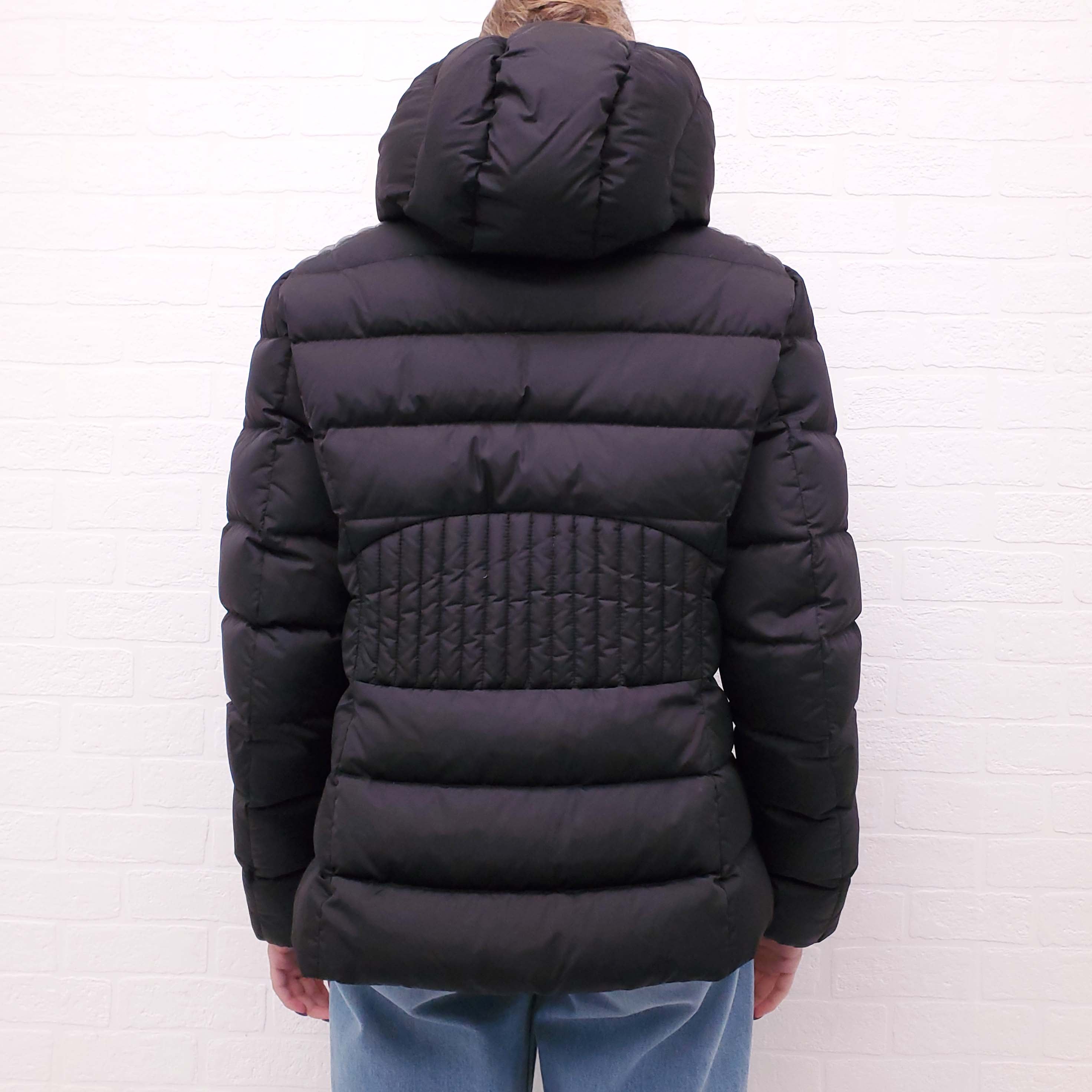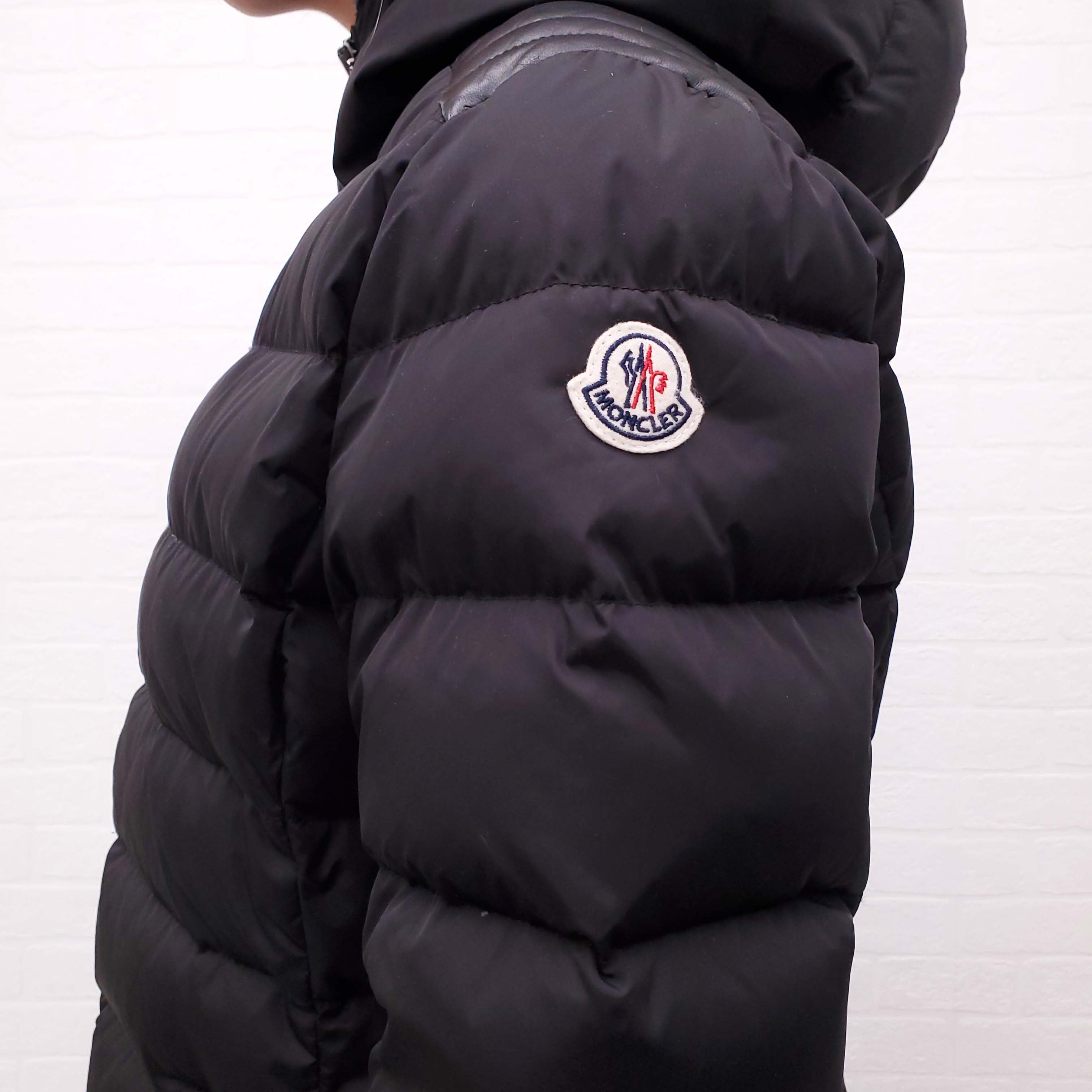MONCLER BLACK PUFFER JACKET WITH LOGO AND LEATHER DETAIL - SIZE 5/XL