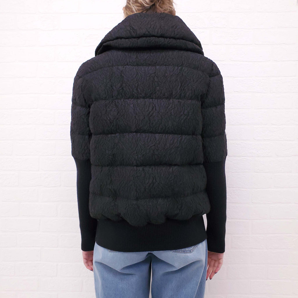 MONCLER BLACK TAPESTRY PUFFER JACKET WITH CAPE AND FLORAL LINING - SIZE 2/M