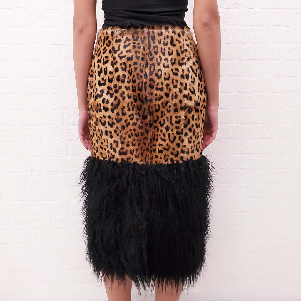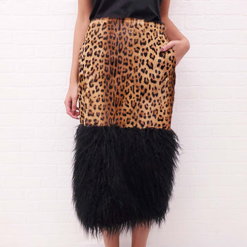 SAINT LAURENT LEOPARD SKIRT WITH BLACK FUR DETAIL - SIZE 40
