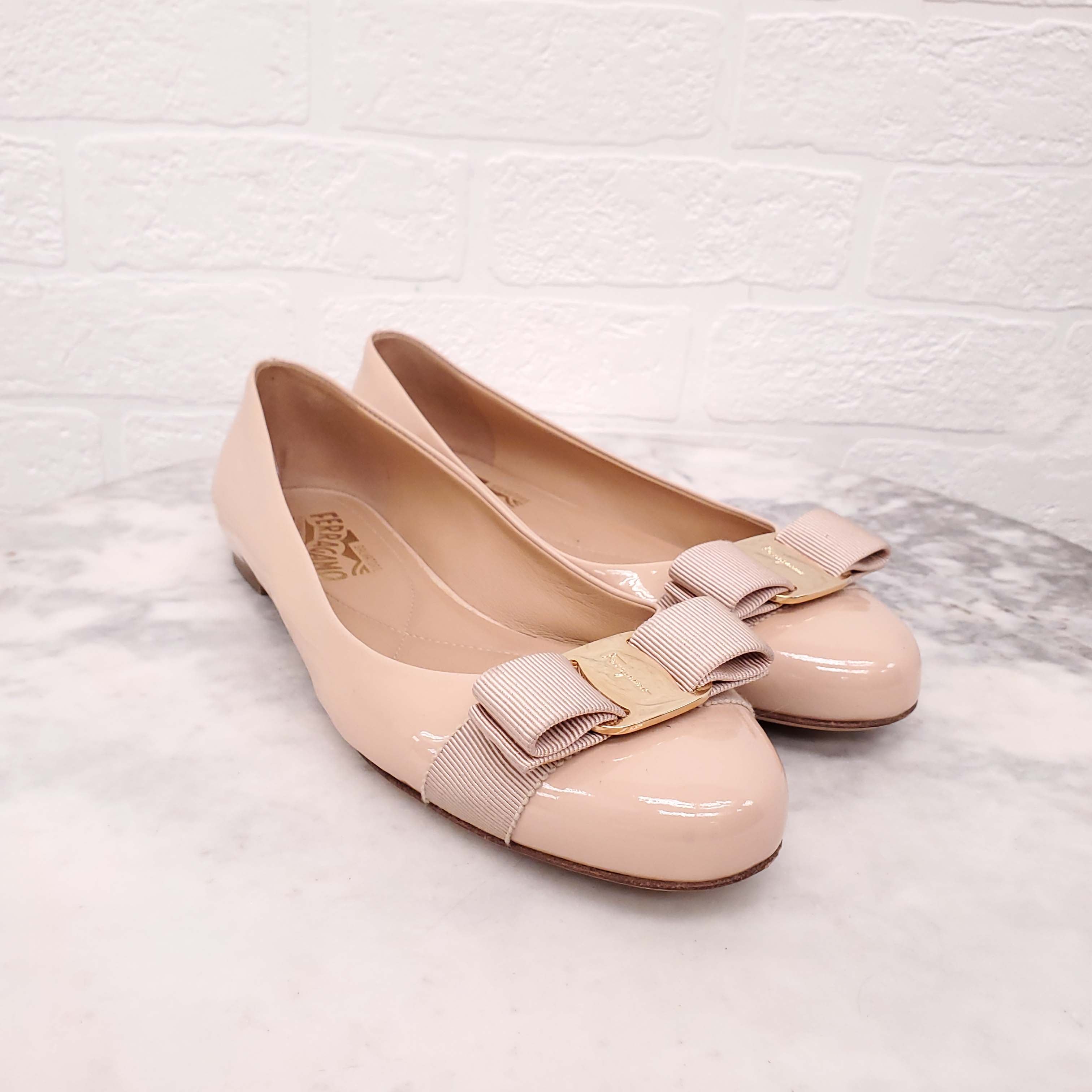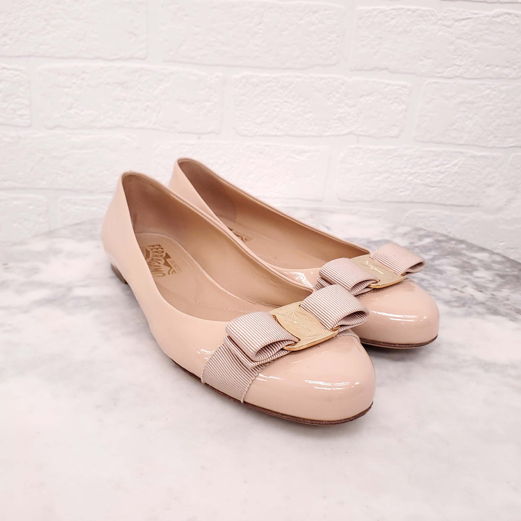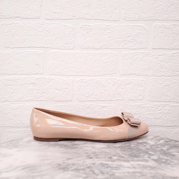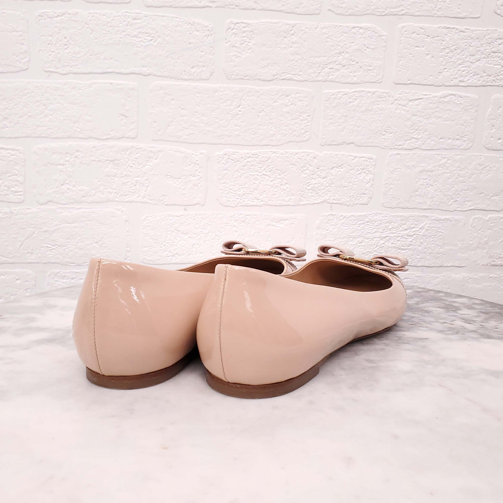 SALVATORE FERRAGAMO NUDE PATENT BALLET FLATS WITH BOW - SIZE 7.5