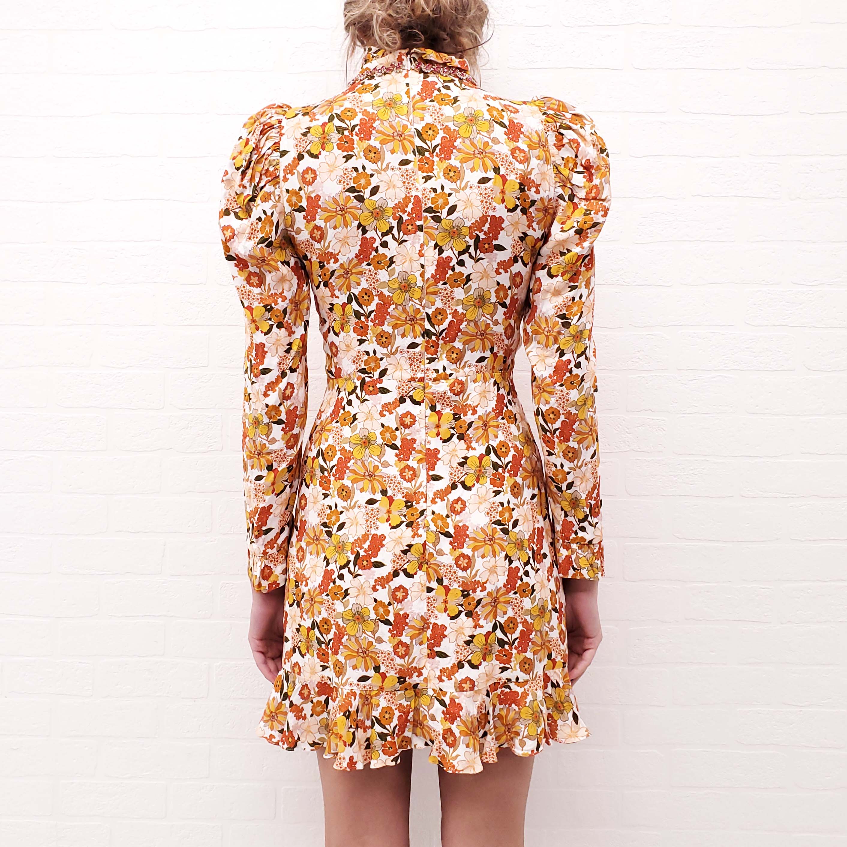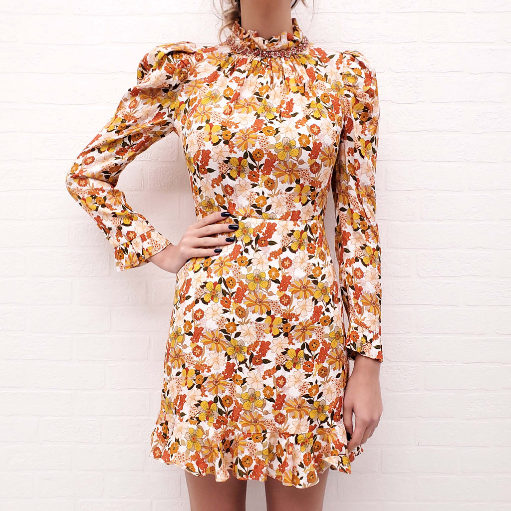 SANDRO ORANGE FLORAL DRESS WITH JEWEL DETAIL - SIZE 34