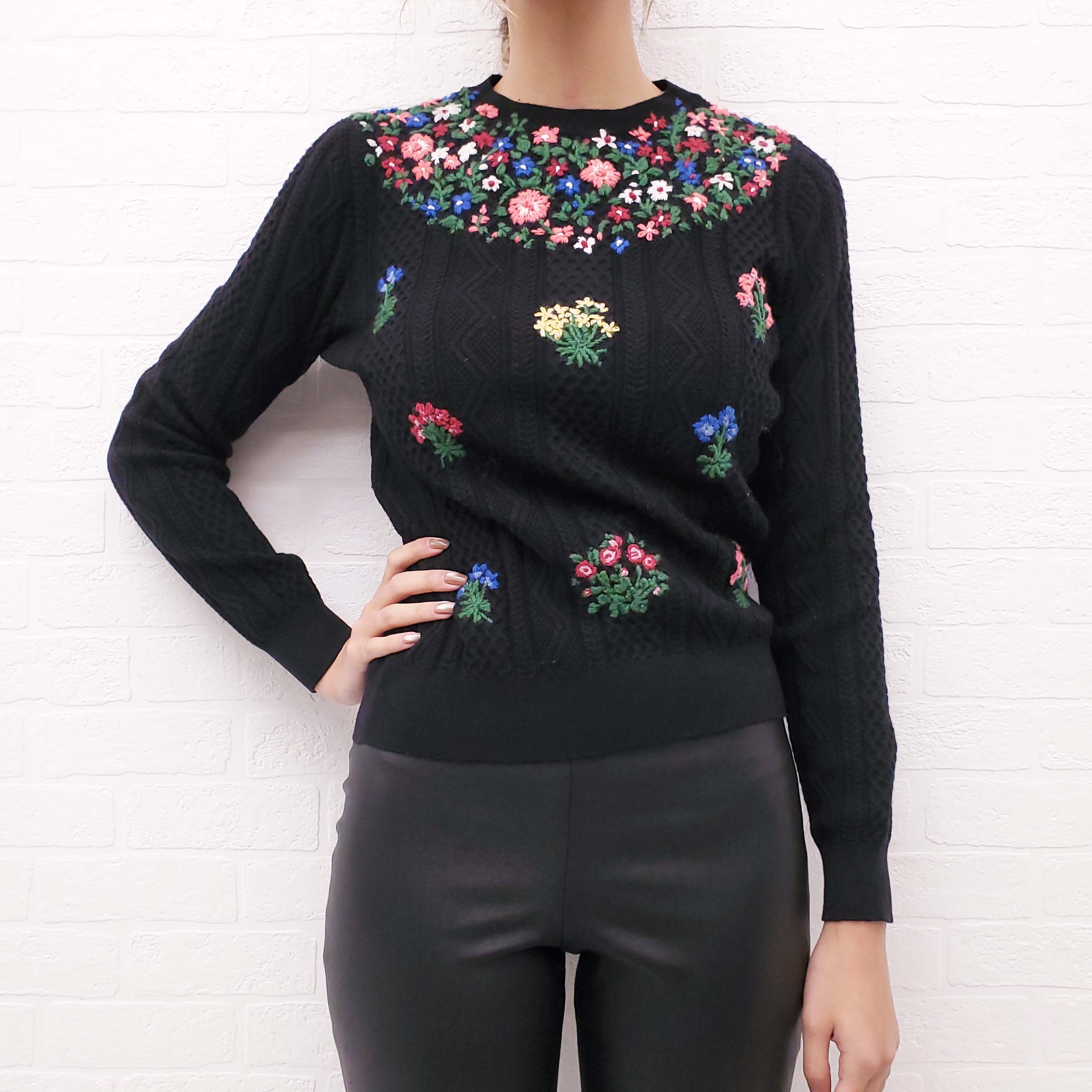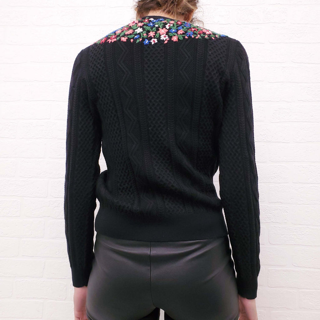 VALENTINO BLACK CABLE KNIT SWEATER WITH FLORAL EMBROIDERY - SIZE M
