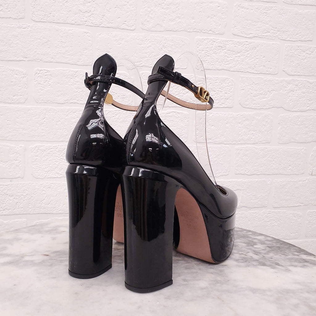 VALENTINO BLACK PATENT 'TAN-GO' PLATFORM HEELS WITH LOGO STRAP - SIZE 35.5