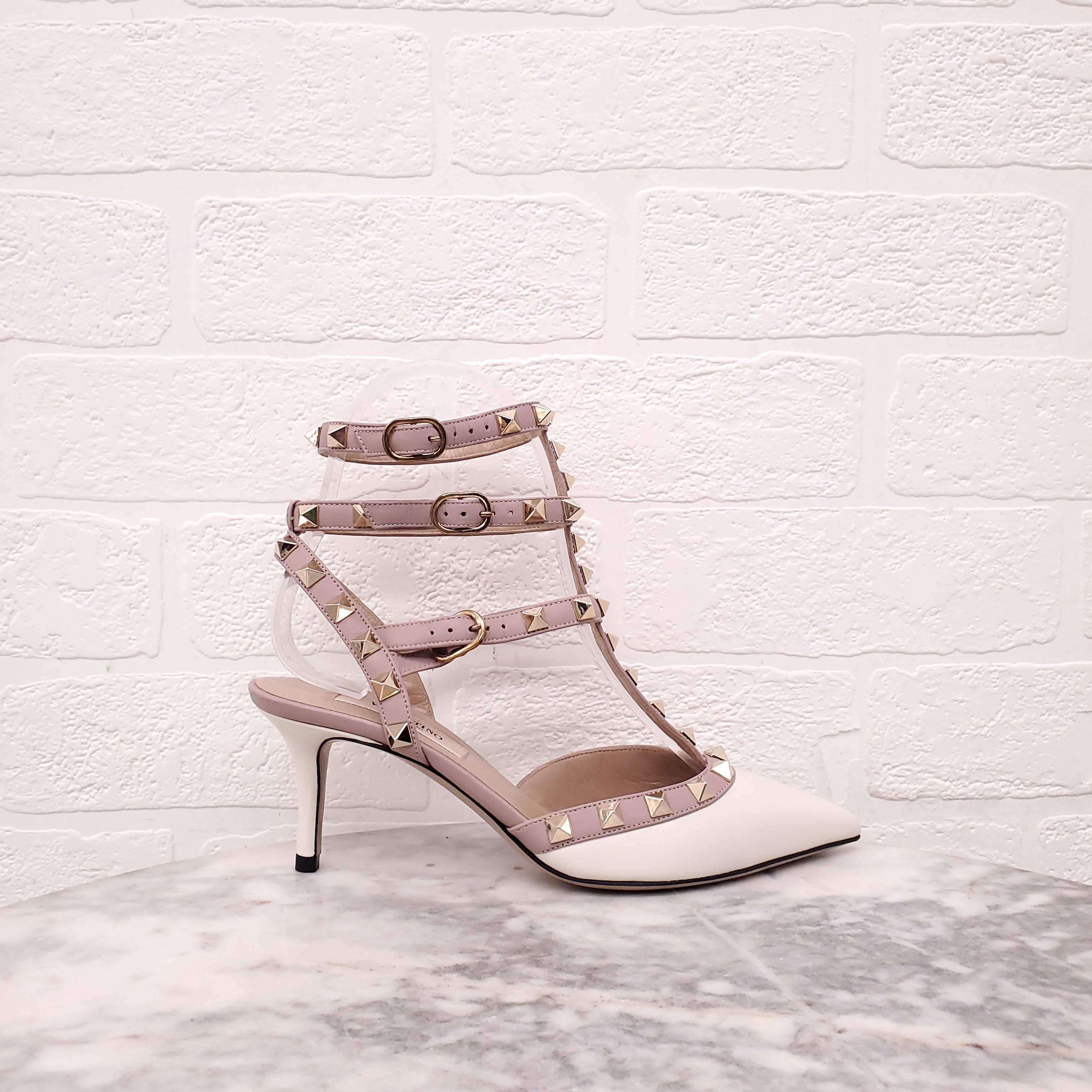 VALENTINO CREAM AND BLUSH ROCKSTUD ANKLE STRAP KITTEN HEELS - SIZE 34