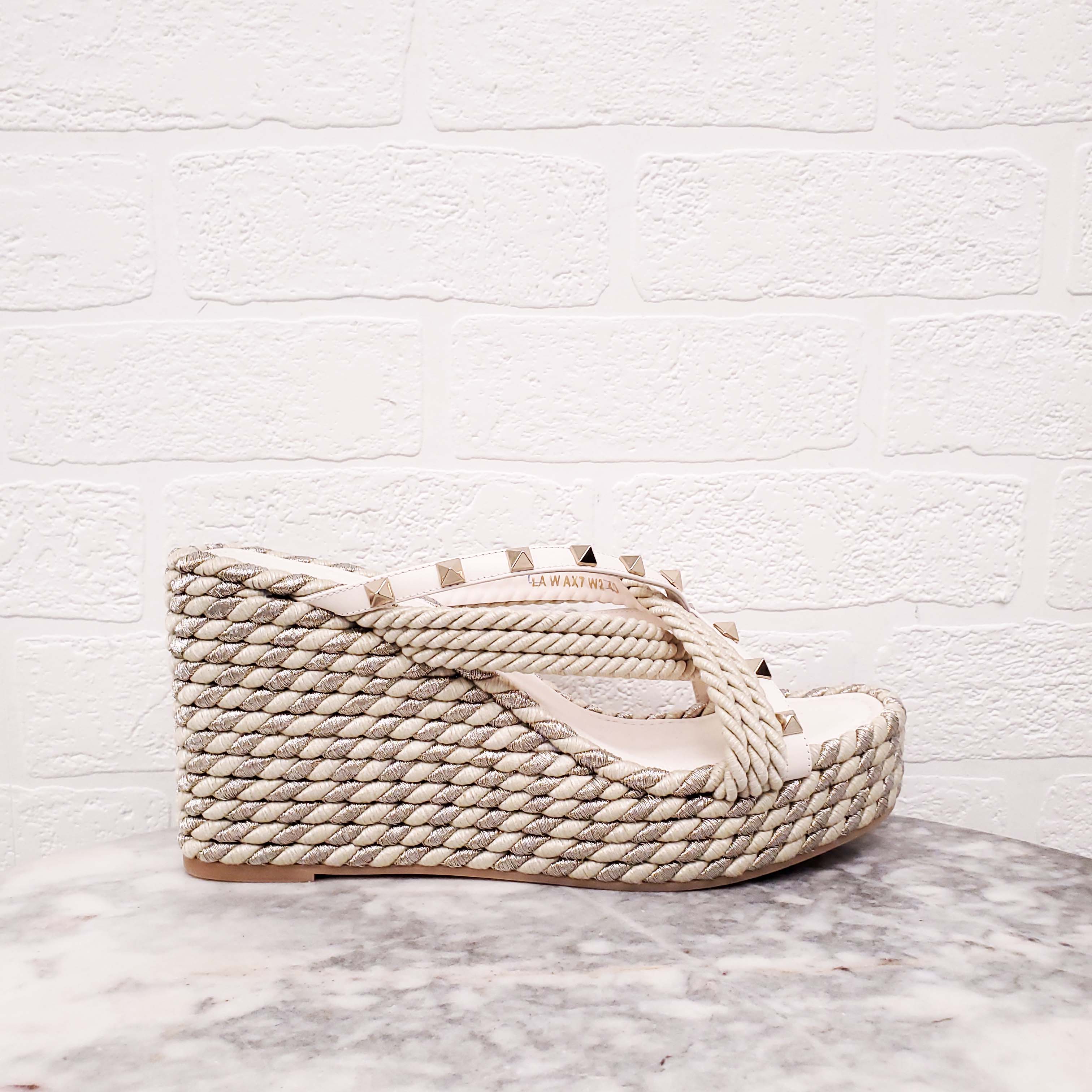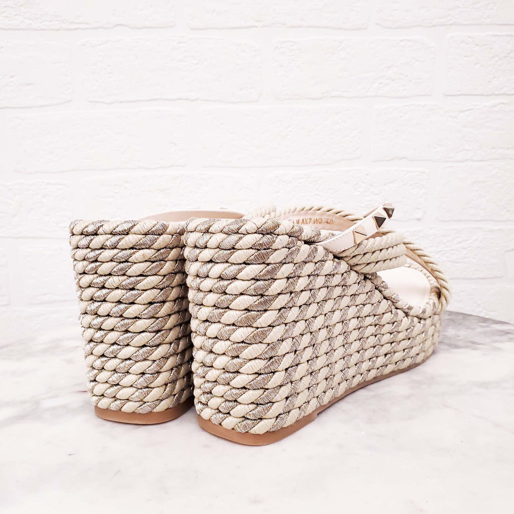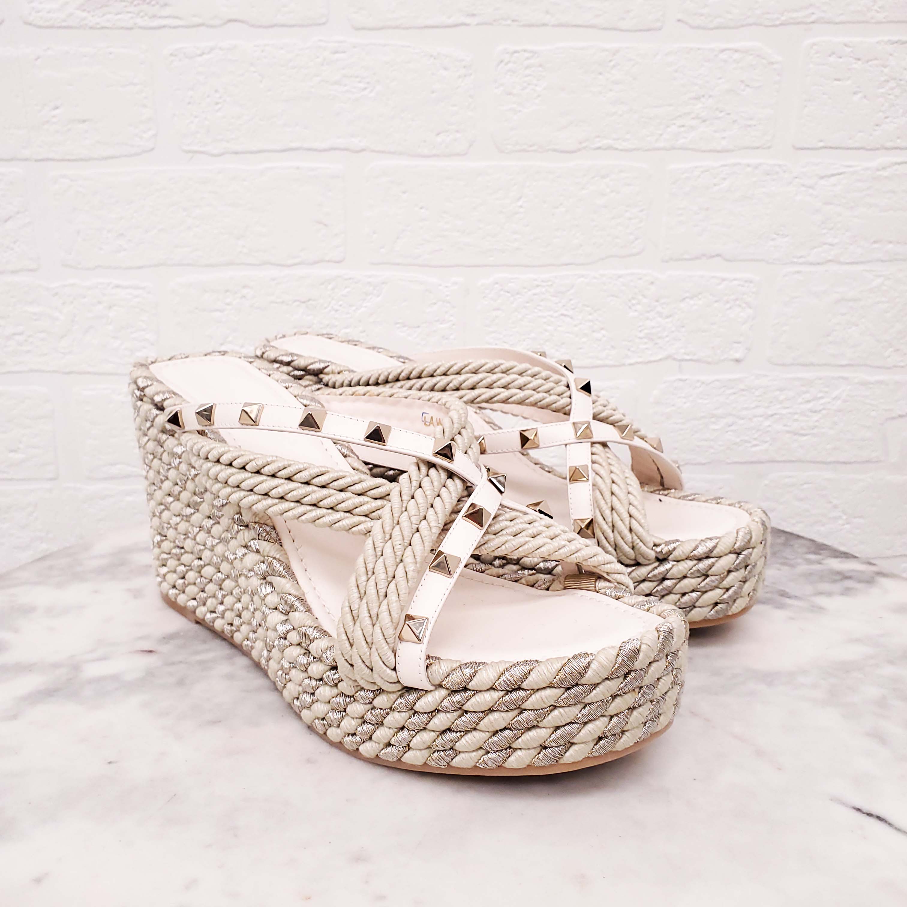 VALENTINO CREAM BRAIDED ROCKSTUD WEDGE ESPADRILLES - SIZE 40