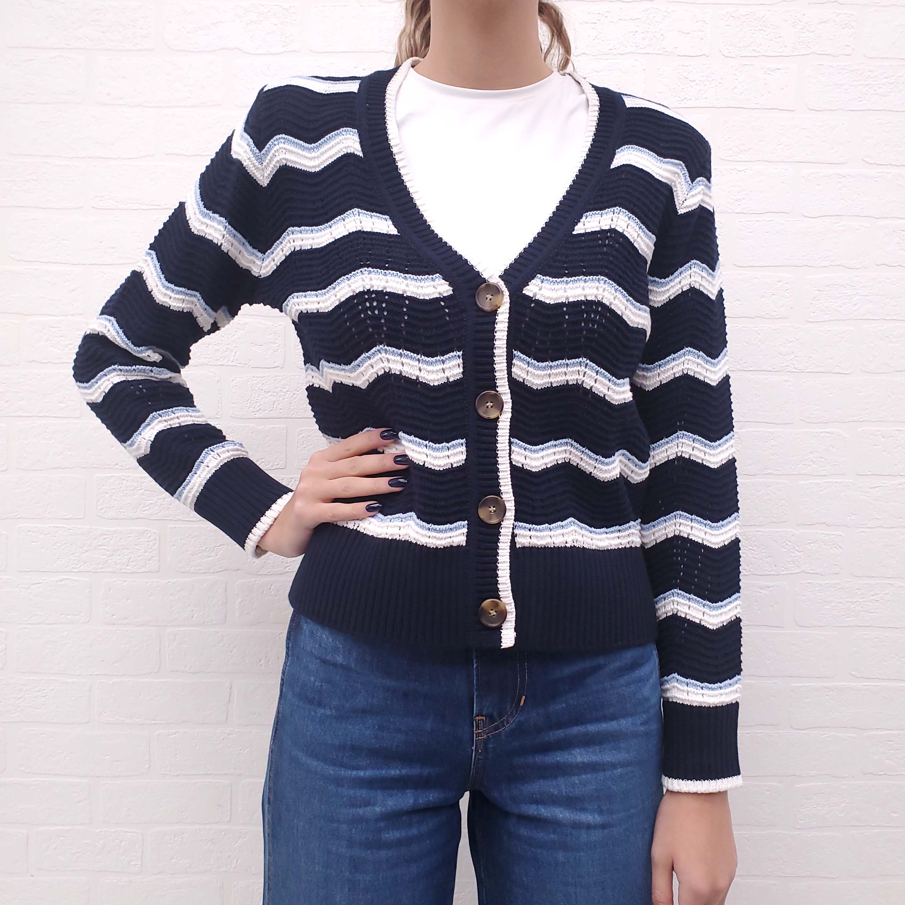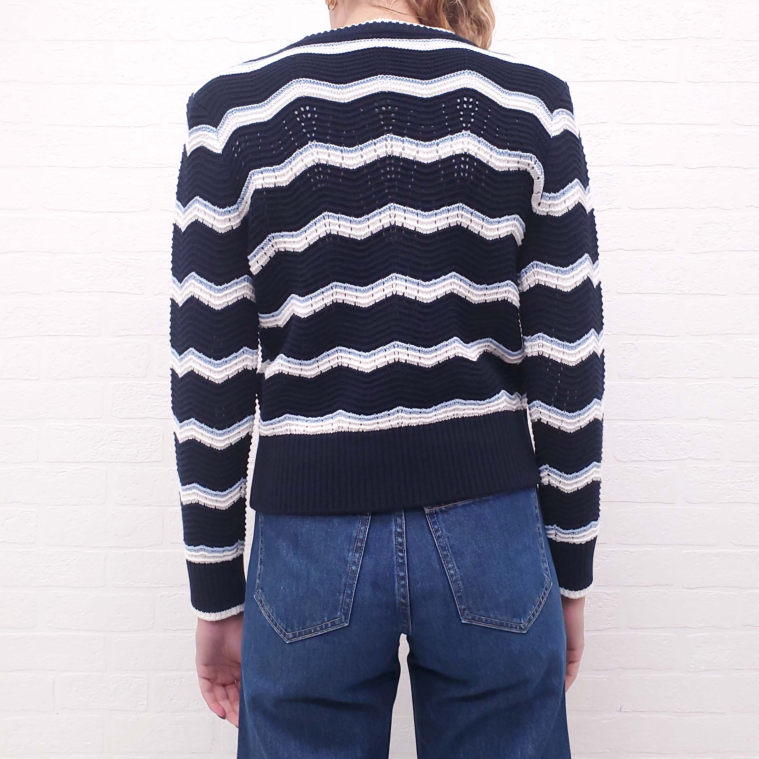 VERONICA BEARD BLUE AND WHITE CHEVRON CROCHET CARDIGAN - SIZE S