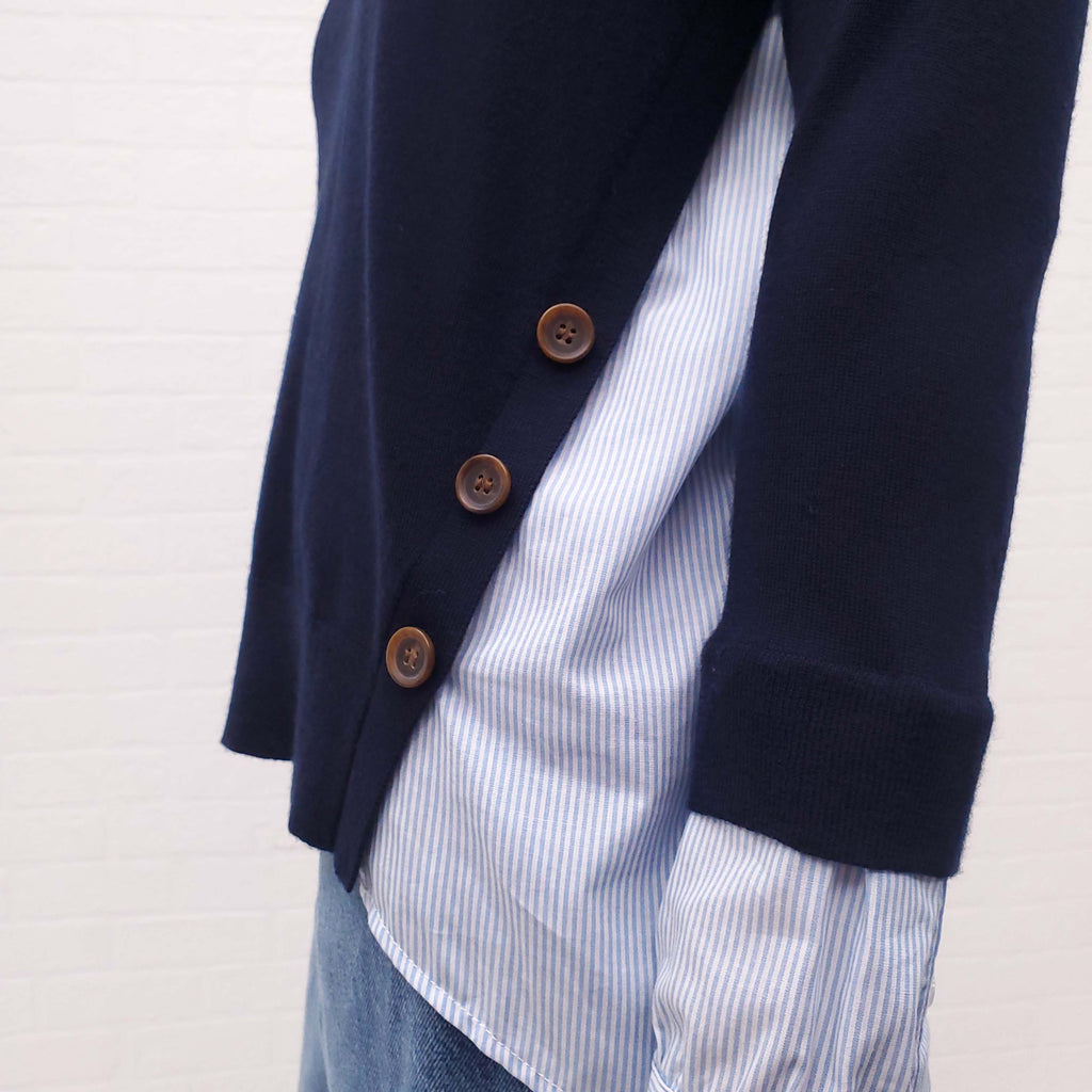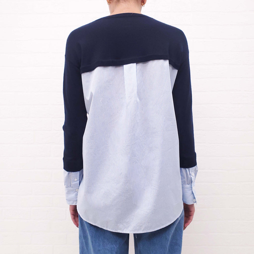 VERONICA BEARD NAVY SWEATER WITH BLUE AND WHITE STRIPE SHIRT DETAIL - SIZE XS