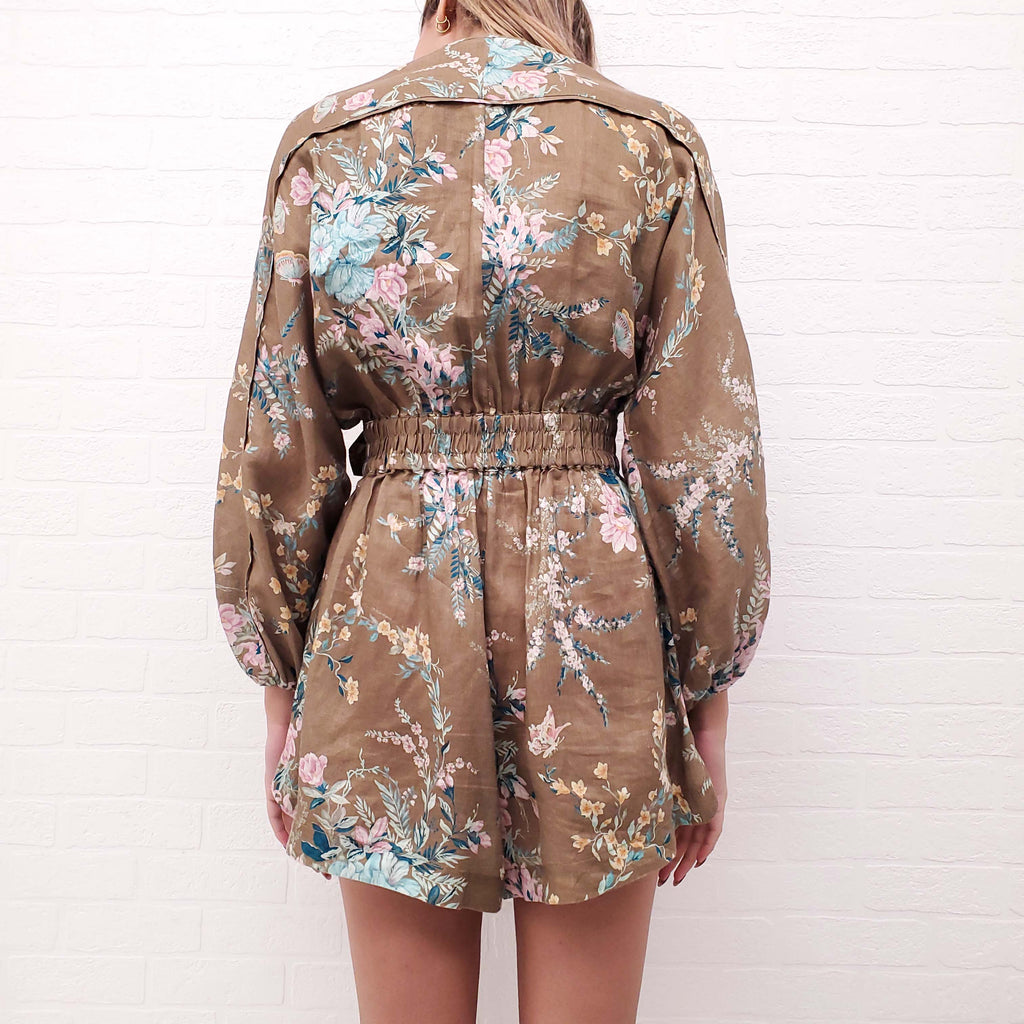 ZIMMERMANN KHAKI FLORAL LONG SLEEVE ROMPER - SIZE 0/XS